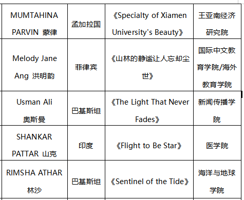 所有获奖作品将于翔安校区坤銮楼B座大厅和国光2“一站式”学生社区展出,定格国际青年眼中真实、立体的中国形象。期待未来更多学子以镜头为笔,以光影为墨,连中外之心,绘就文明互鉴的动人画卷。