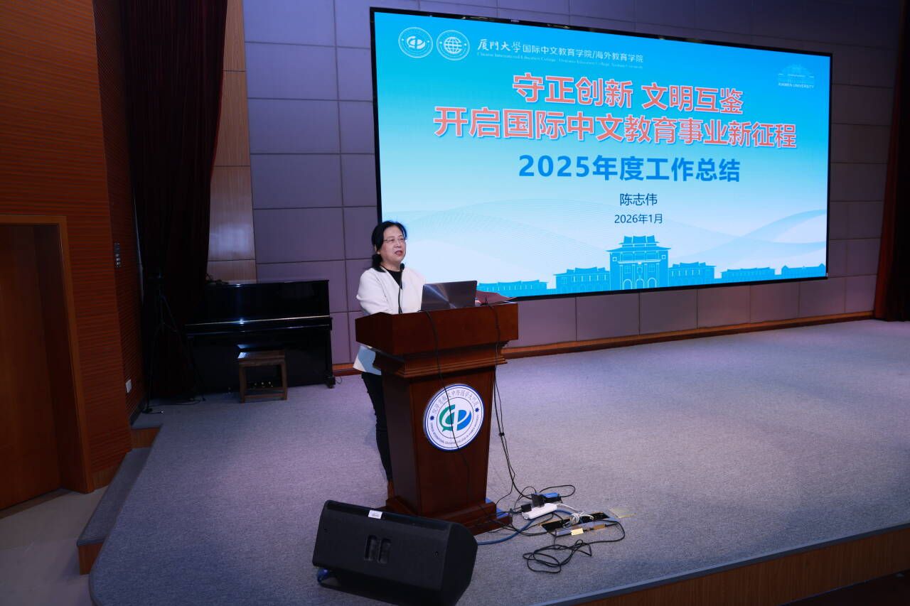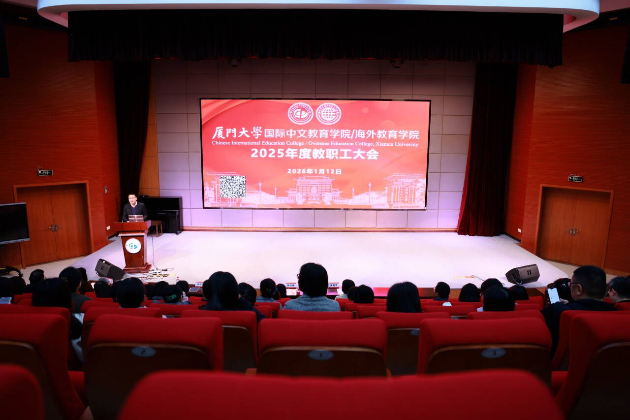 1月12日,厦门大学国际中文教育学院/海外教育学院2025年度教职工大会在坤銮楼B102报告厅隆重举行。学院党政领导及全体教职工齐聚一堂,共同回顾总结2025年工作,擘画2026年发展蓝图。大会由学院党委副书记李启忠主持。