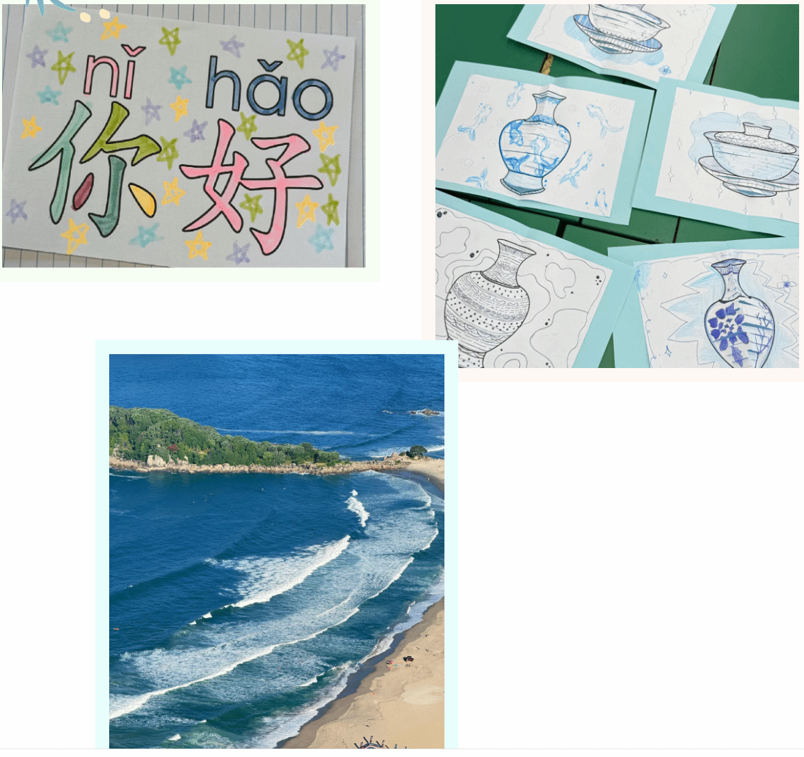 每一节课,都是一场新的冒险。面对七、八年级的零基础学生,我不再仅仅讲授拼音和字词,而是努力让中文“活”在他们的世界里。课堂上,我们用中文做游戏、唱中文歌曲、演小剧。学生扮演“小小导游”介绍新西兰,也用简单的中文描述自己的家人和兴趣。有时候,他们会因为一个声调的错误引起哄堂大笑,而笑声过后,他们却能准确地纠正刚才的发音。 语言的学习就像种树,水要一滴一滴地浇。于是我将“写字课”设计成一场跨越时空的文化之旅。从硬笔到毛笔,从古老的甲骨文到现代的整字结构,学生在一笔一划中体会汉字的演变与美感。看着他们专注地描摹“家”“友”“爱”,那些线条仿佛也在诉说他们对中文的理解——认真、纯粹,且充满生命的温度。