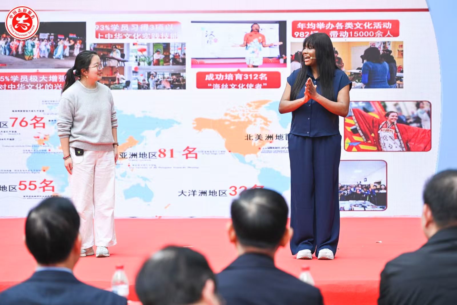 在活动的国际志愿服务展演环节,“瀚宇之花”国际中文教育志愿者代表钱倩与9・8投洽会金钥匙志愿服务队、厦门日报社国际传播中心国际志愿服务队代表登台亮相,以舞台剧形式向社会公众讲述厦门大学“瀚宇之花”国际中文教育志愿团队在世界各地播种中文与中华文化种子的故事。