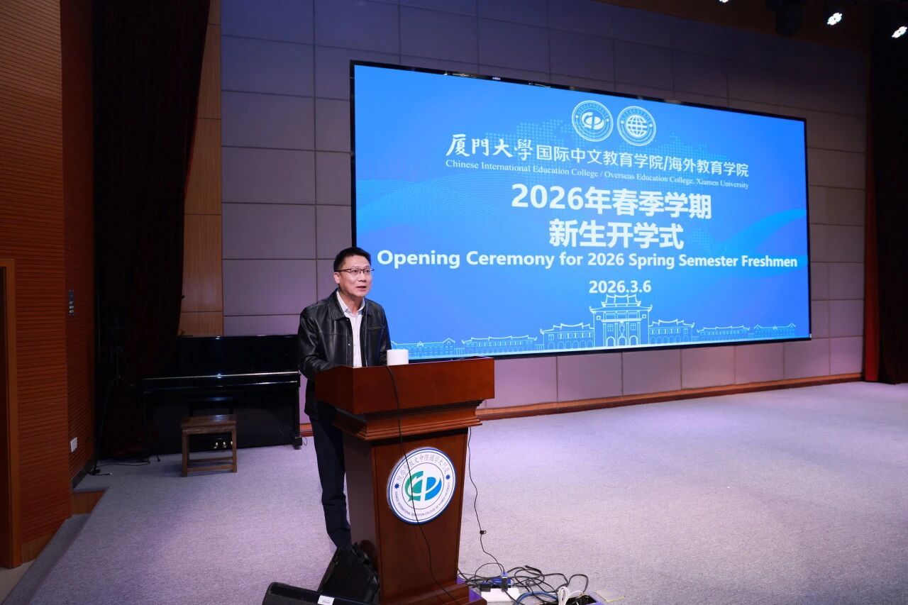 3月6日下午,学院2026年春季学期国际新生开学式在翔安校区坤銮楼B102顺利举行。学院党委书记许美霞、院长陈志伟,厦门市出入境管理局四级高级警长苏一强、五大队副大队长白慧源,翔安校区学生办公室主任兼学生工作部(处)副部(处)长林明华,学院副院长潘超青,华文系主任朱宇,华文系副主任孟繁杰、郭建花,以及部分教师代表、辅导员、党政管理人员出席仪式,全体2026级春季国际新生参会。开学式由学院党委副书记李启忠主持。