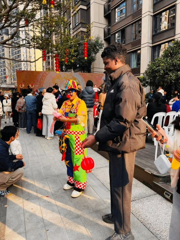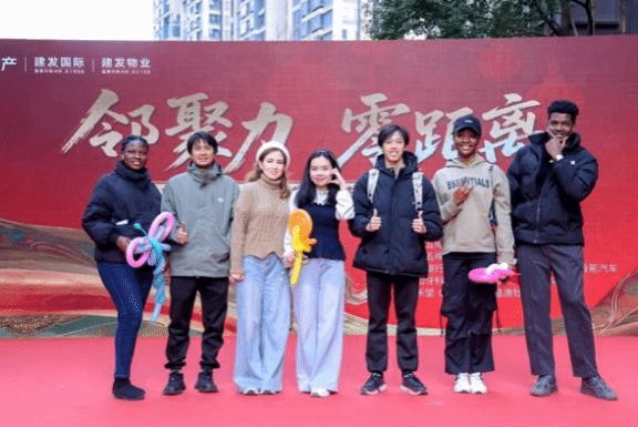 烟火氤氲,邻里相融。依托共建资源,同学们走进建发五缘映月社区,深入中国人的日常生活场景,参与小区新春系列民俗体验活动。同学们在社区内参与集福运活动,领取分发的糕点,感受新春福运的美好;随后走进享福铺年味集市,沉浸式体验各类年味摊位,在热闹的集市氛围中捕捉中国年的烟火气息;晚间,大家前往中庭广场,观看居民自发举办的“小区春晚”,现场鼓声铿锵、歌声嘹亮。退休阿姨们演奏的非洲鼓曲目吸引了非洲留学生沙米勒,他感慨道:“这乐器太熟悉了,从没想过会出现在中国的小区里,看到阿姨们热情演奏,很新奇也很有趣。”这场由居民全程“一手包办”的晚会节目丰富多样,沙米勒和同学们在邻里的温情与欢声笑语中,近距离触摸中国家庭的春节烟火温情,深刻体会到中华民俗文化中的邻里情谊。