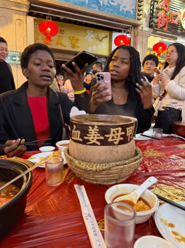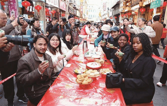 人声鼎沸,暖意融融。在厦门日报社国际传播中心的安排下,同学们来到厦门中山路镇邦路,参与“茶桌仔”与“流水席”系列新春民俗体验活动。活动中,大家围坐骑楼茶桌旁,亲身体验闽南茶道,品尝贡糖、炸枣等闽南特色茶歇。来自马来西亚的蔡顺茗同学感慨道,中文名字里的“茗”字让她与中国茶结缘,在这里品茗听乡音,倍感亲切;晚间,大家围坐流水席前,品尝姜母鸭、土笋冻等闽南美食,了解流水席的民俗内涵,尼日利亚的舒畅同学通过视频连线向远方家人分享这份喜悦,尼泊尔的杨帆同学则对土笋冻的独特风味赞不绝口,同学们在茶与美食的交融中,沉浸式领略中华春节文化的深厚底蕴,真切感受闽南民俗的独特韵味。
