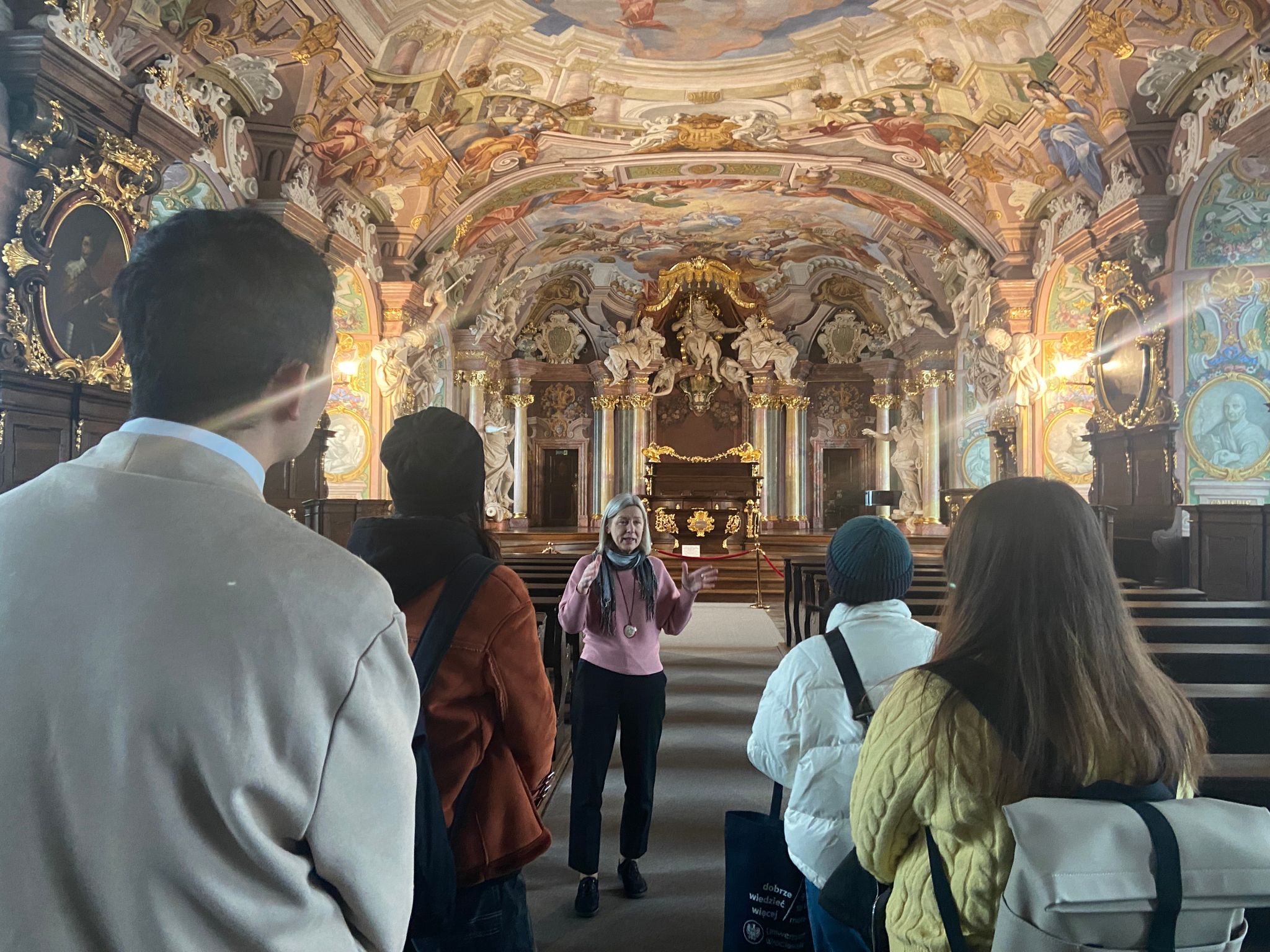 随后,Urszula Broda女士带老师们走进富丽堂皇的学校大礼堂利奥波德礼堂(Aula Leopoldina)。据介绍,每年学校的学位授予仪式和重要的会议都在此处举行。