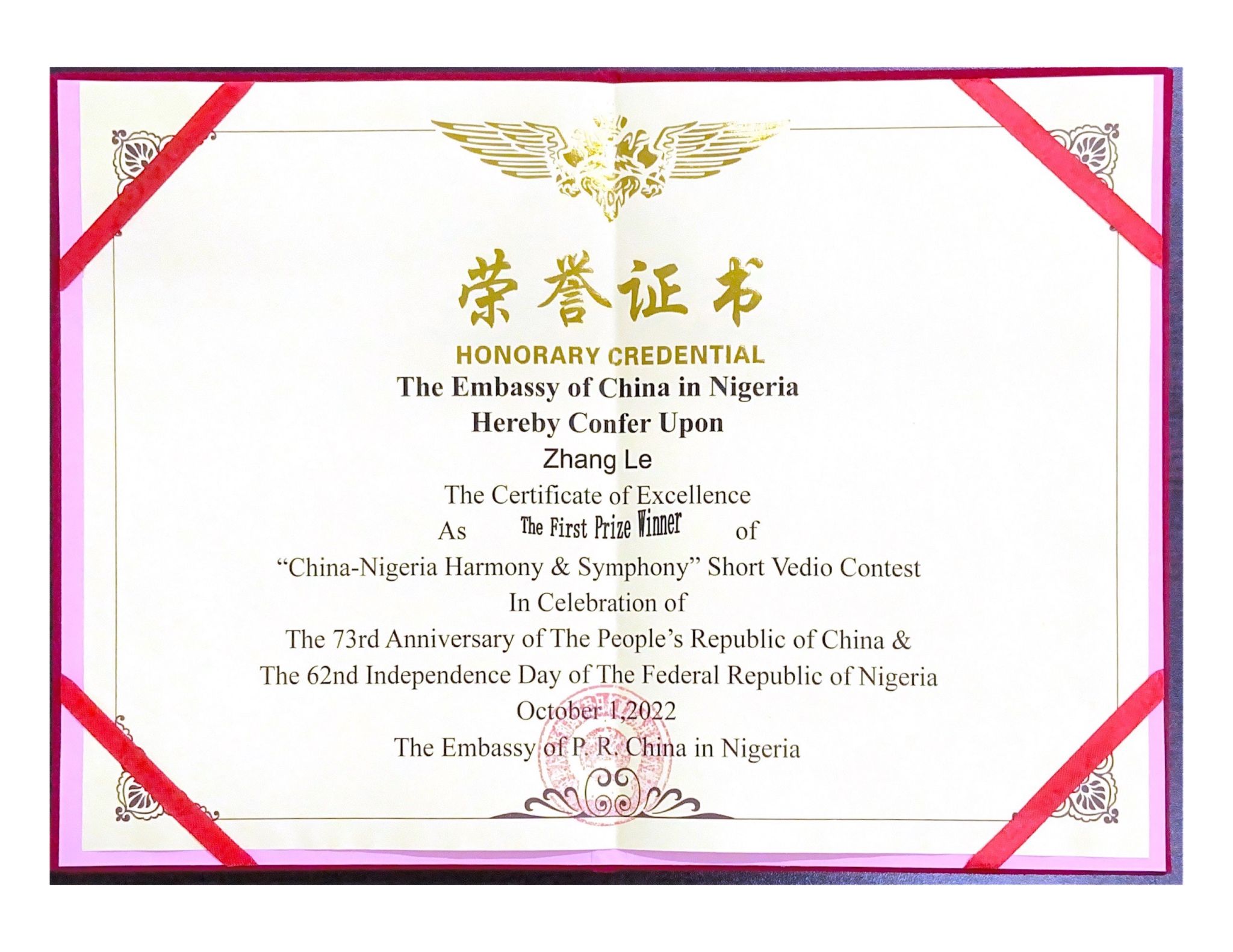 “中尼和乐章”短视频赛是中尼共迎同为10月1日的国庆节而举行的。据悉共收到来自尼日利亚全国各地的约60件参赛作品,参赛者中既有尼日利亚本国公民,也有来自中资企业等驻尼机构的中国公民。张乐老师在她的短视频作品《和乐章》中,围绕阿奇克韦大学中文系的四位在读大学生,撷取了她们各自的学习和生活片段,叙议结合,声情并茂,生动而又深刻地揭示了她们眼中的中国“和”文化以及中尼两国间的深厚情谊。整个作品以其巧妙的构思、鲜明的主题和精良的制作赢得了评审团的认可,张乐老师的作品从众多的参赛者中脱颖而出,荣膺短视频比赛一等奖的殊荣。
