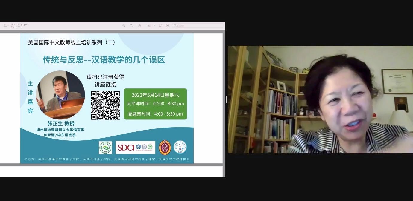 2022年5月14日,夏威夷时间下午4点到5点、太平洋时间晚上7点到8点半,由美国亚利桑那中医孔子学院、圣地亚哥孔子学院、夏威夷玛利诺学校孔子课堂、夏威夷中文教师协会联合举办的美国国际中文教师线上培训系列讲座(二)《传统与反思》,通过线上会议的形式如期举行。
