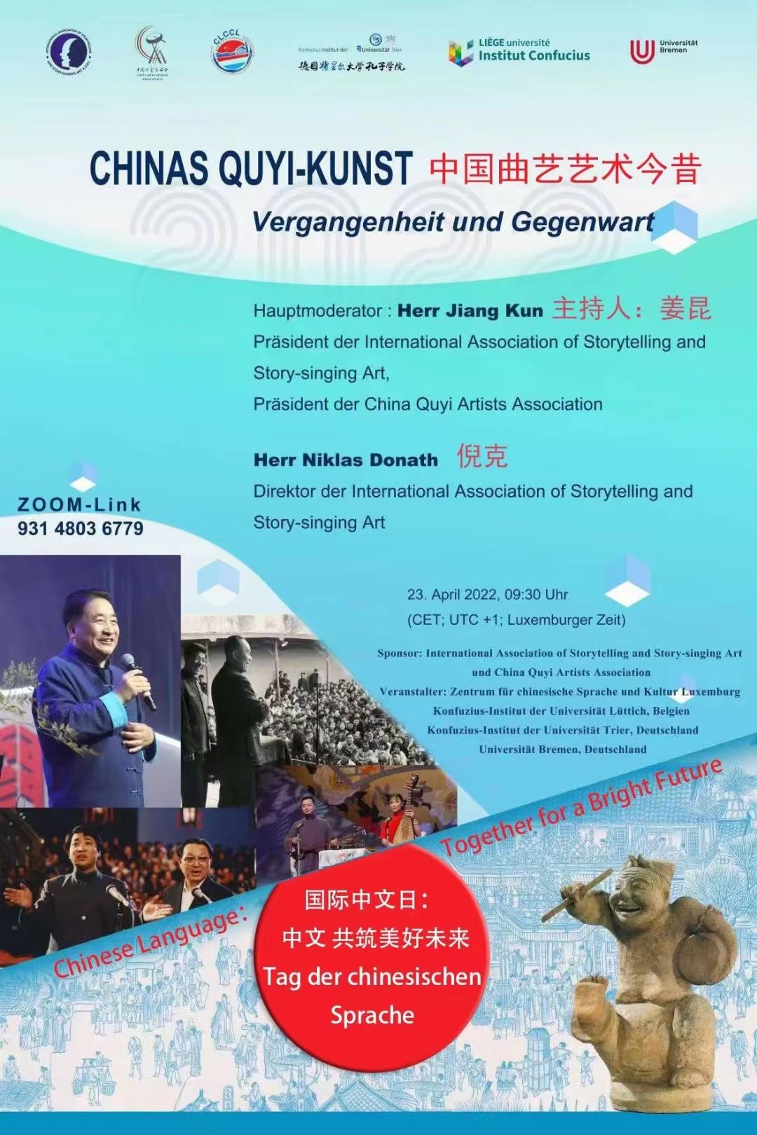 本周六,在中国曲艺家协会、卢森堡中国语言文化中心和比利时列日孔子学院的共同协办下,德国特里尔大学孔子学院师生与著名的表演艺术家姜昆老师共聚云端,从时间与地域两个维度领略中国说唱艺术的魅力。