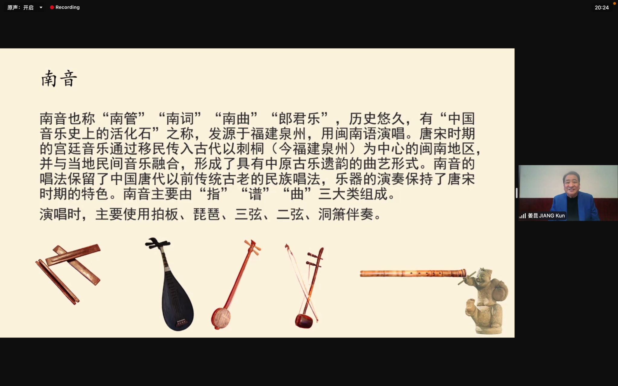 生动的说唱俑展示将观众带入历史长河;充满艺术想象力的《山海经》故事,折射了中国说唱艺术在朝代更替和文明进步中的发展变化;地域间的比对充分展示了这门民间艺术与各个民族文化的深度交融和相互影响。讲座纵览千年曲坛脉络,横观神州艺苑奇葩。精彩纷呈:京韵大鼓、苏州评弹、东北二人转……特别是由“指”、“谱”、“曲”构成完整的音乐体系的南音,是中国现存历史最悠久的古音乐,有“中国音乐的活化石”之称。2009年被联合国教科文组织列为人类非物质文化遗产代表作的南音,为听众带来了更为新鲜的体验!
