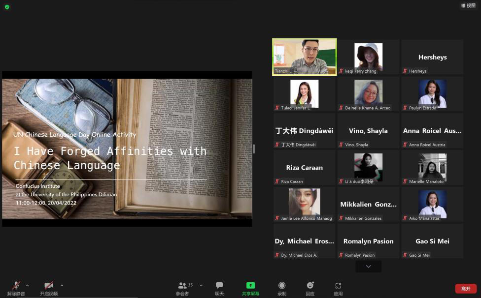 《我的中文奇缘》作为菲大孔院中文日主题系列活动的第五场,于4月20日如约而至。李田智老师带领学员们感受了中文的特有魅力。李老师首先向大家介绍了联合国中文日,联合国日内瓦办事处的官员们流利的中文展示,赢得学员们阵阵喝彩。随后李老师分享了来自中文爱好者的故事,学员们积极参与,表达出自己喜欢中文的原因。长城、川味火锅、春节等等,大家对这些精彩的中华文化符号表达出浓厚的兴趣。最后李老师还分享了一些语言学习技巧并带领大家体验了中文联盟和北京语言大学出版社的线上学习资源,鼓励他们多多尝试,不断提升中文水平。