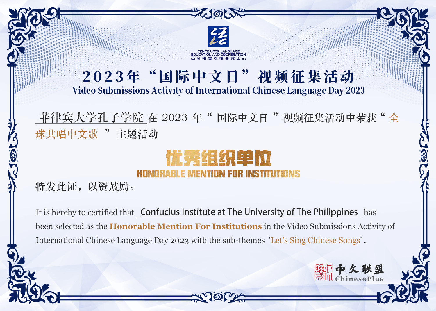 近日,菲律宾大学孔子学院在2023年“国际中文日”视频征集活动中荣获“全球共唱中文歌”主题活动优秀组织单位奖。