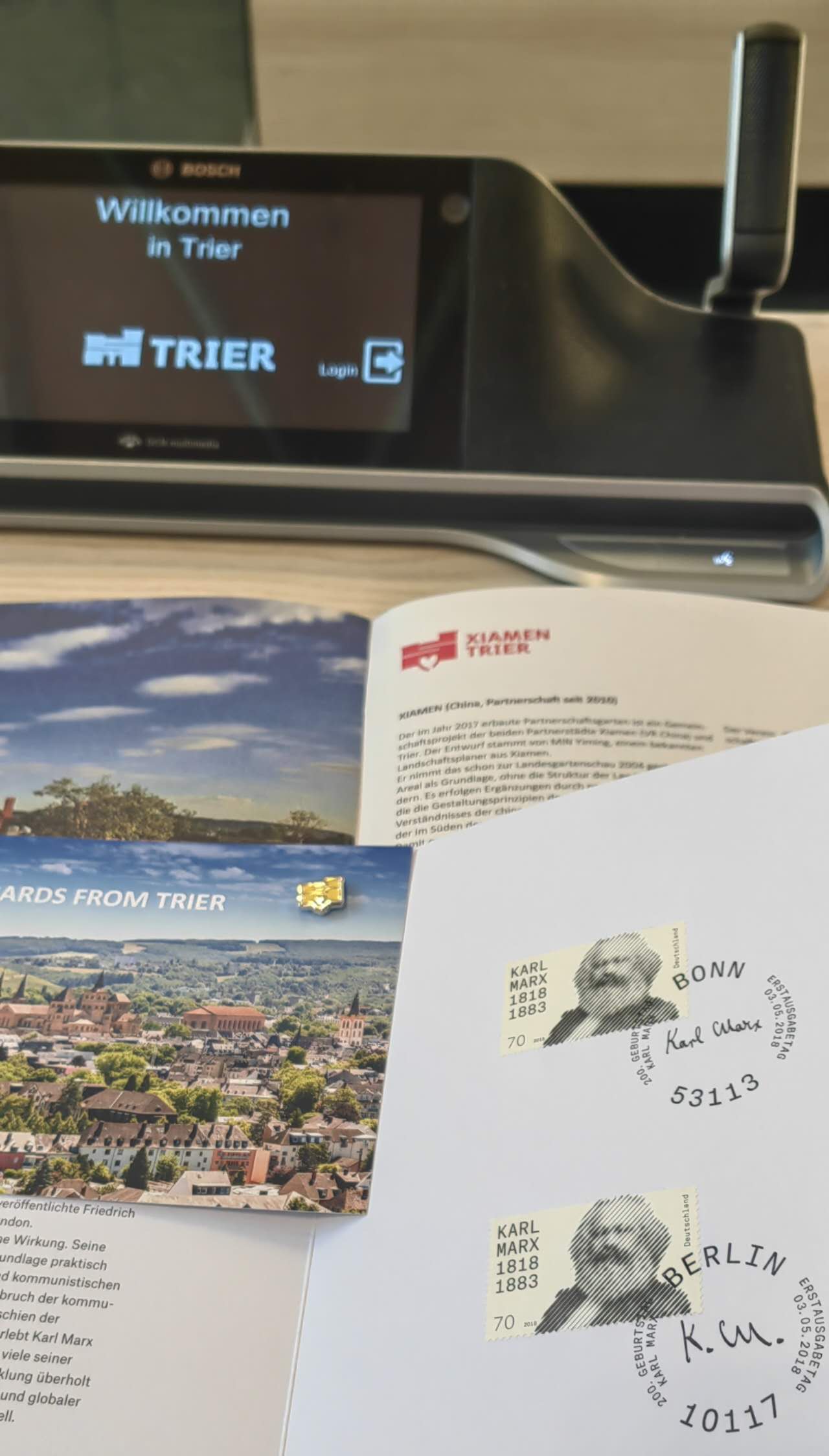 特里尔市政府精心为客人准备的城市礼物:特里尔市欢迎贺卡、市徽别针和马克思诞辰两百周年纪念邮票