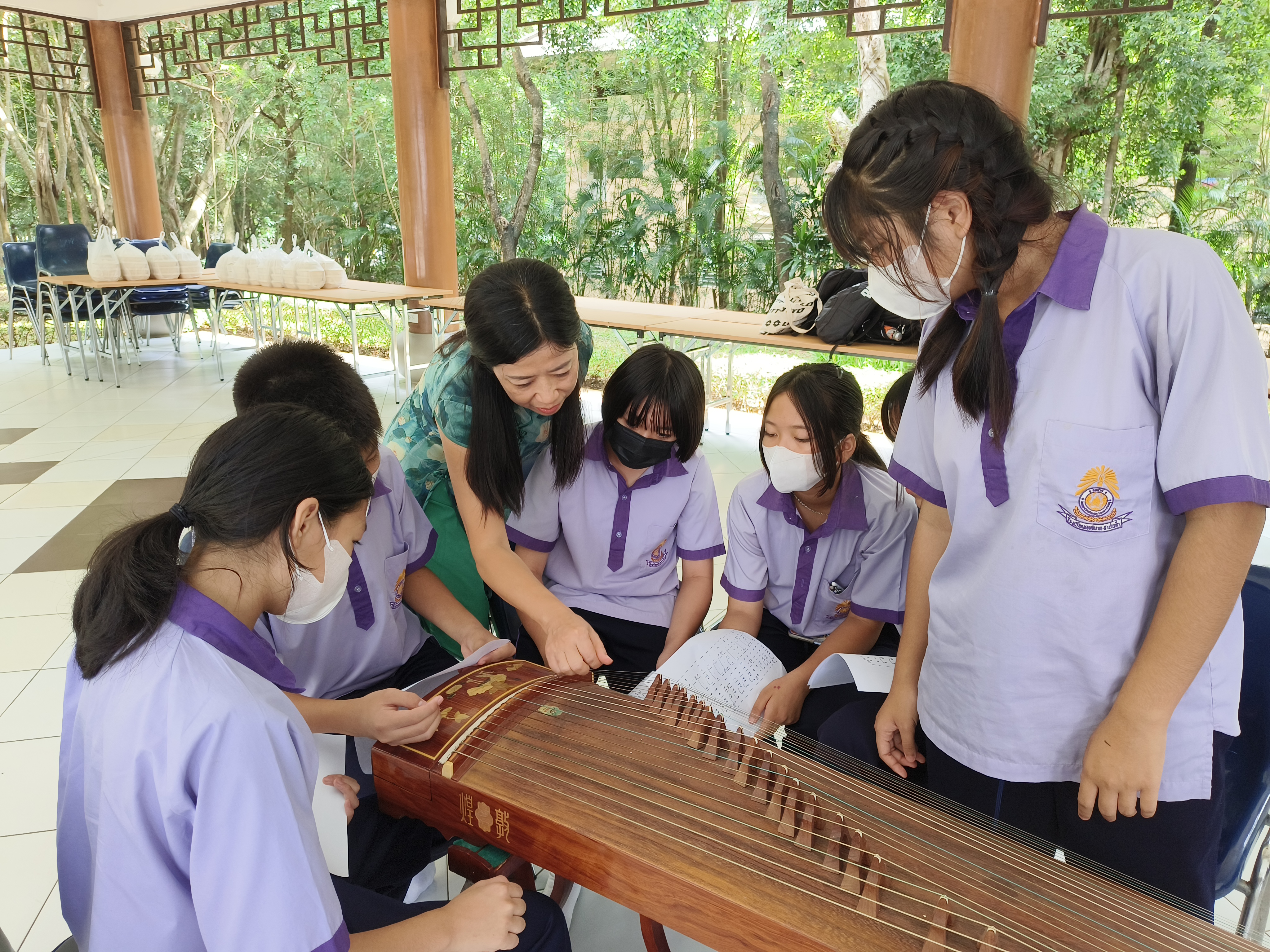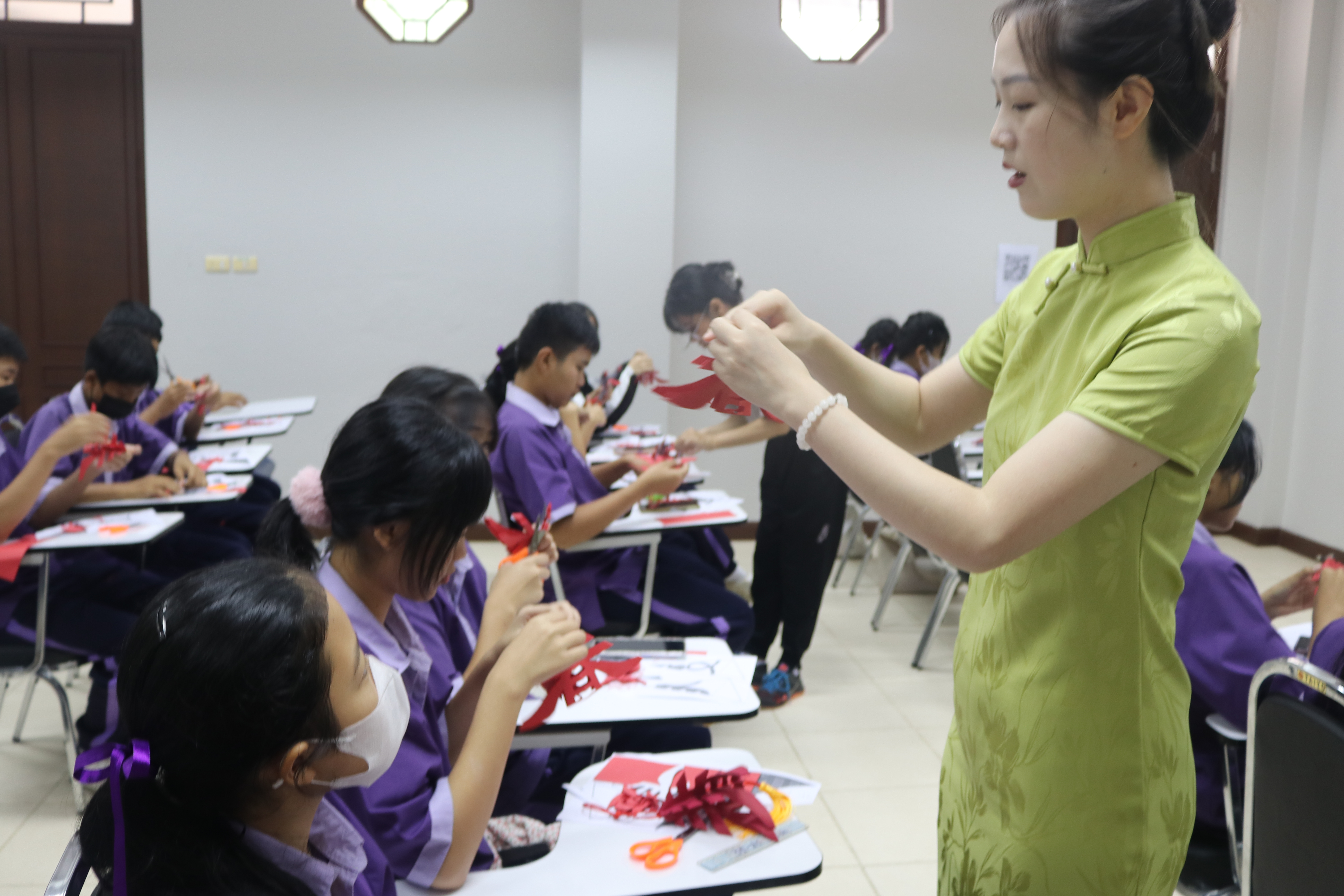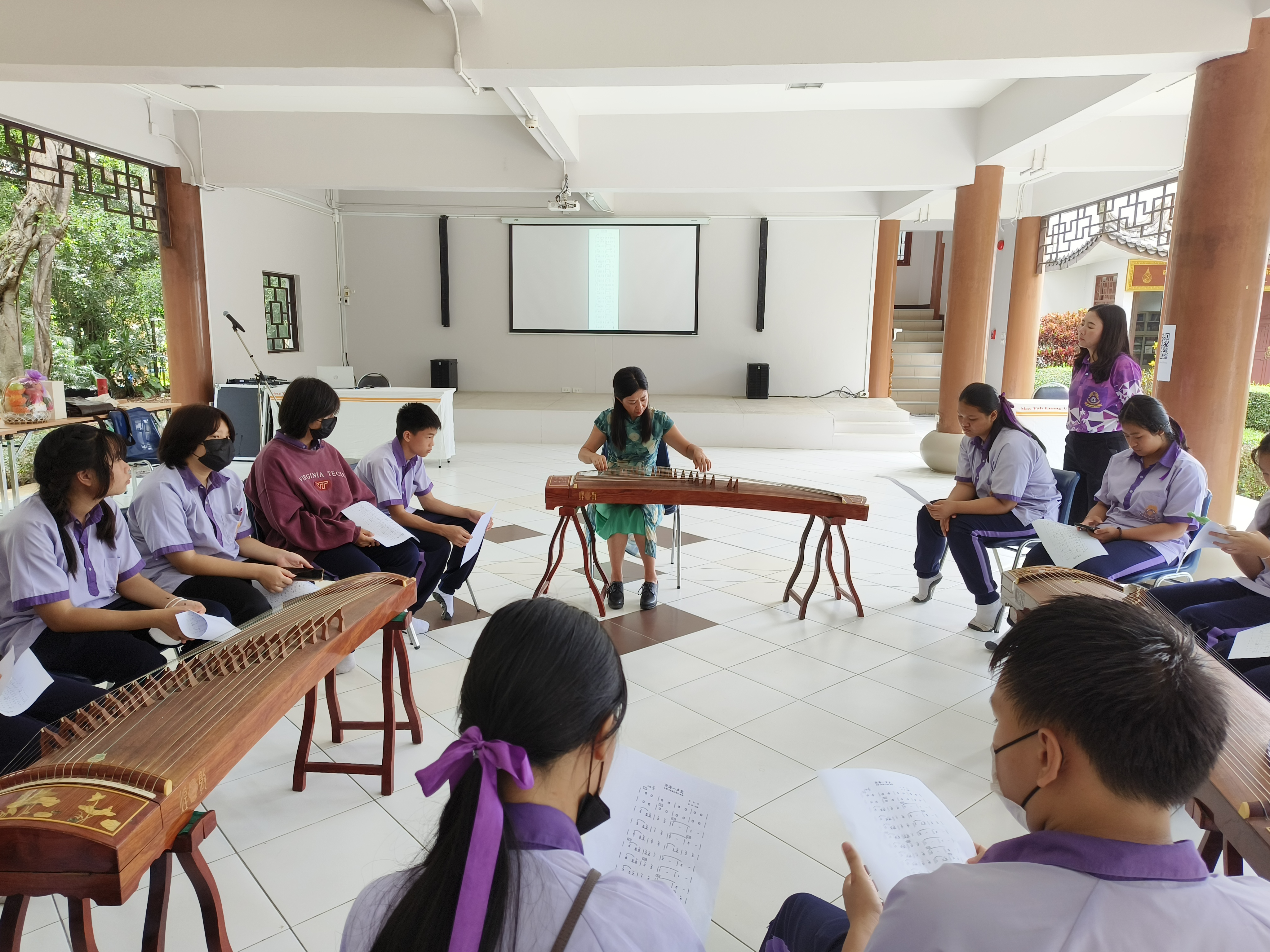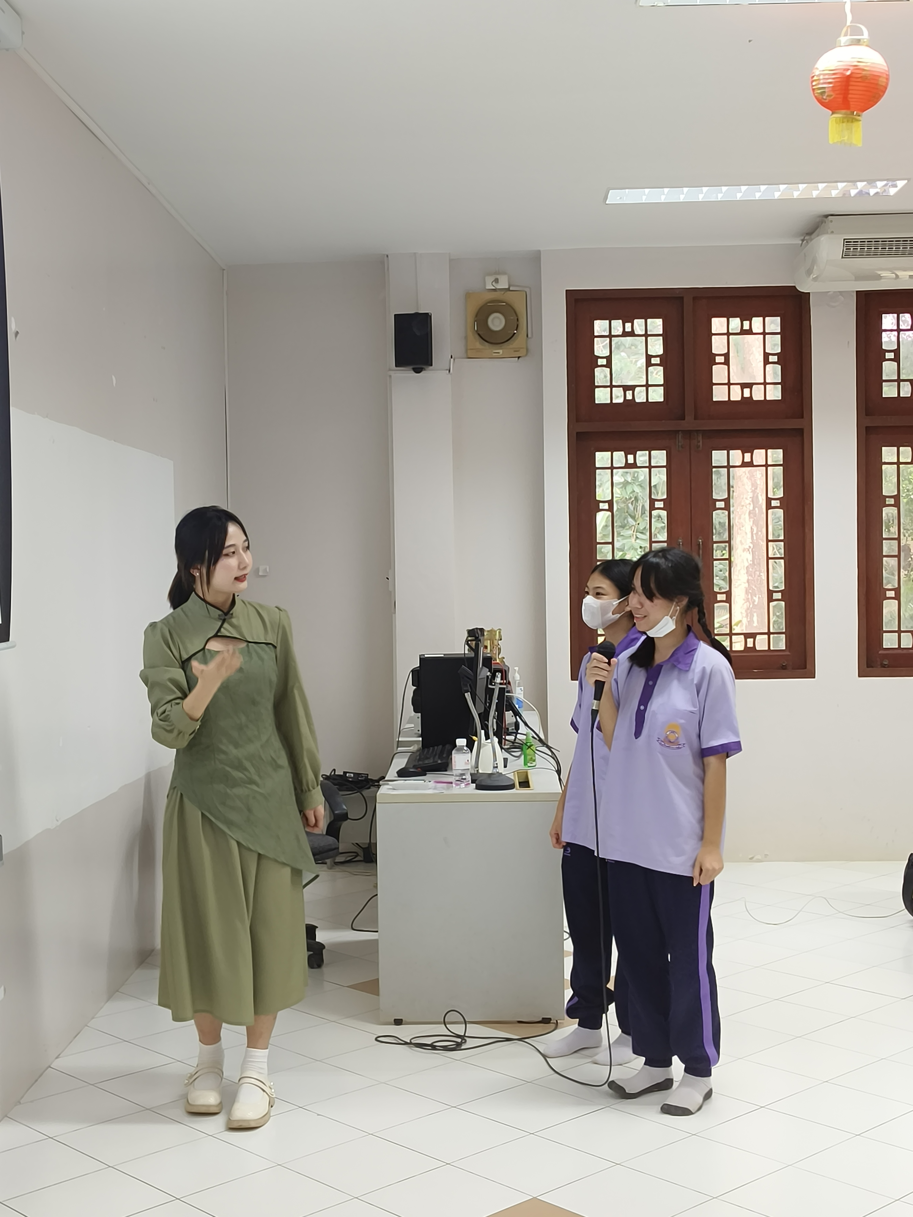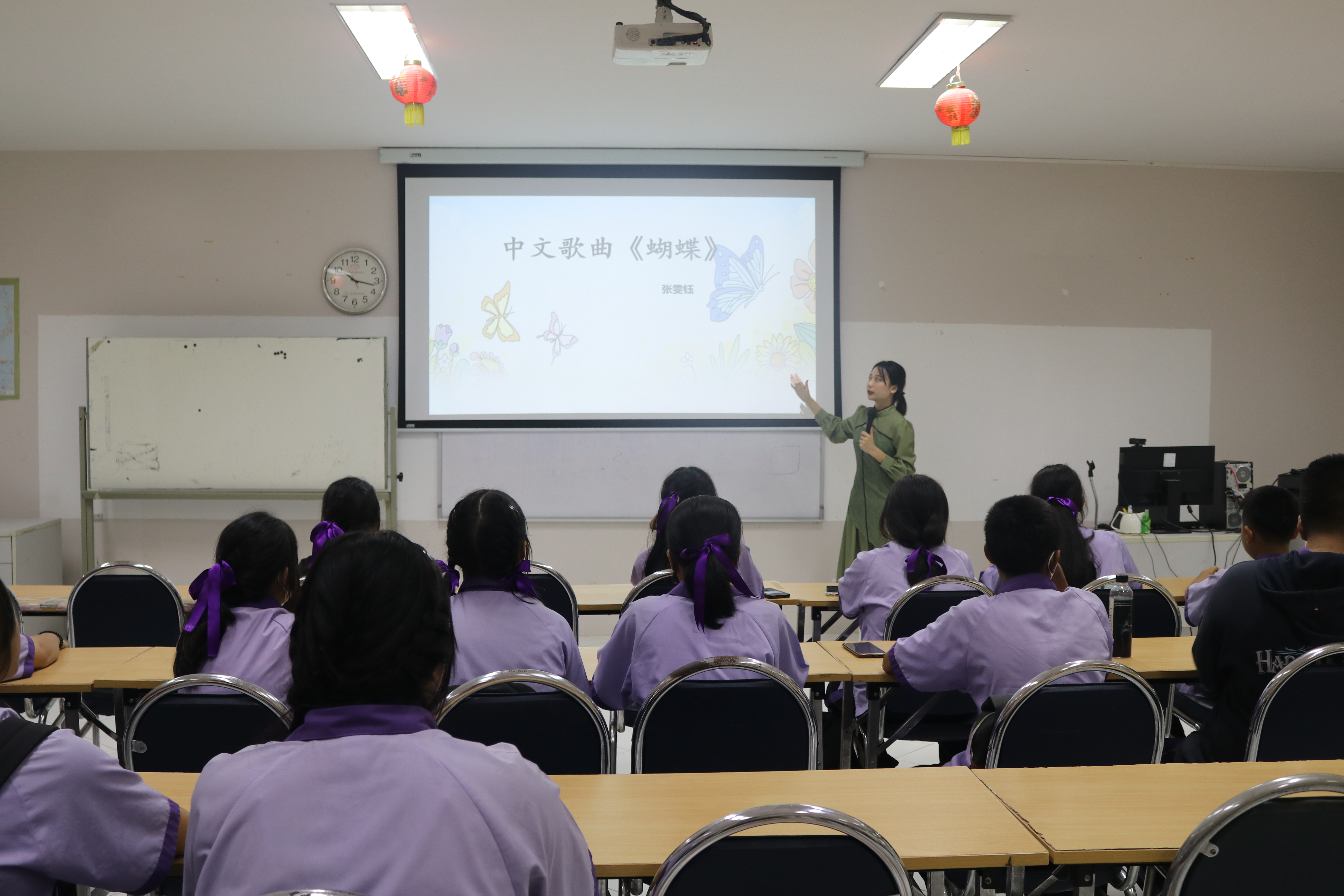 张雯钰老师在中国歌曲学唱课上教学生们唱了一首深情悠扬的歌曲《蝴蝶》,她首先向学生们介绍了这首歌曲的背景和意义,这首歌是根据中国民间爱情故事《梁祝》创作而成,她给学生们讲述了这个凄美的爱情故事,学生们都被梁山伯与祝英台真挚的感情所打动。接下来,张老师一边逐字逐句地介绍歌词大意,一边一句句带领学生们哼唱,极具艺术细胞的泰国学生们很快就找到了乐感,学会了这首歌。在互动环节中,老师邀请学生们单独或结伴上台表演,营造出了欢快的气氛,让学生们在轻松的氛围中感受到中文歌曲的魅力。