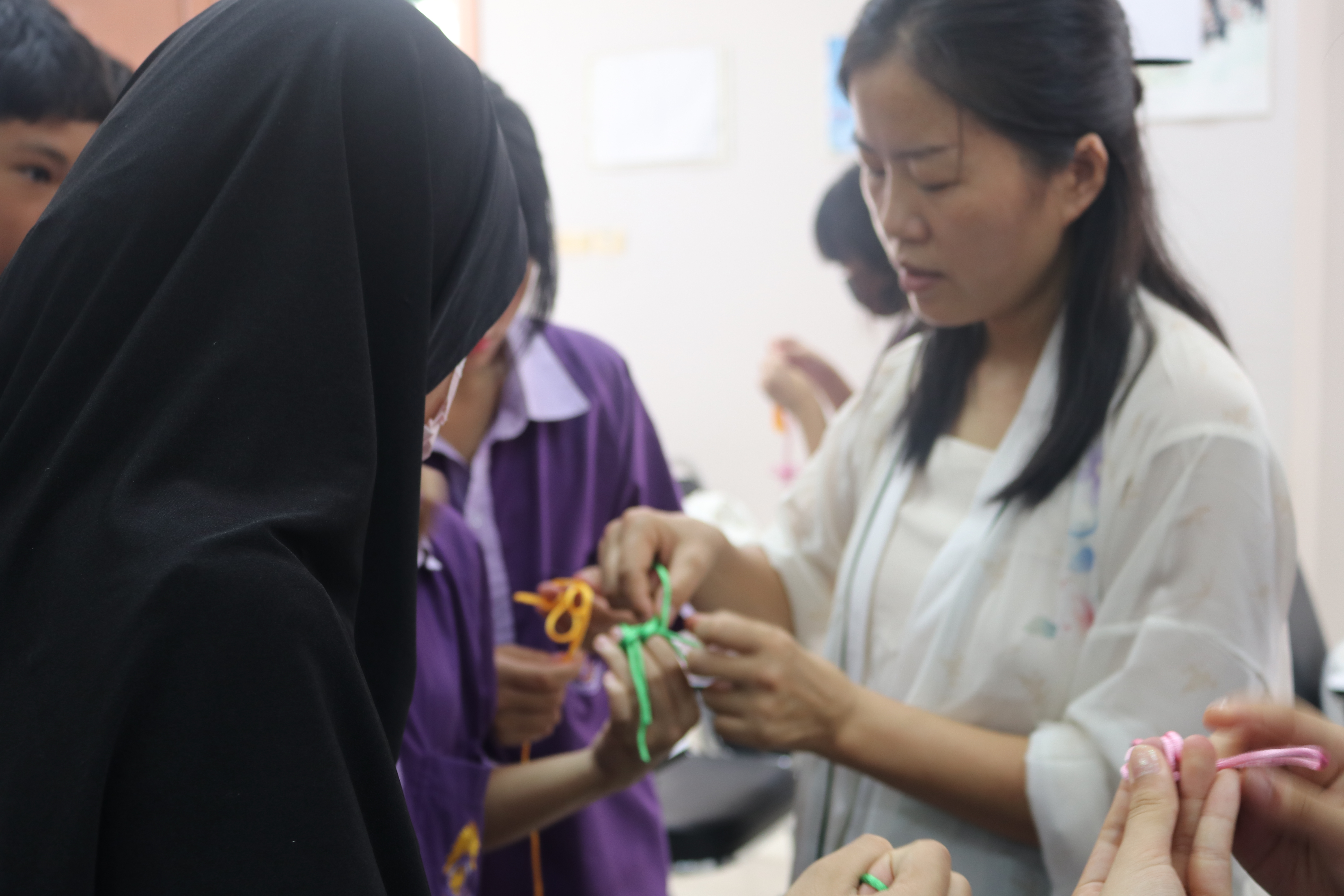 杨巧波老师向同学们介绍了作为中国传统工艺品中国结的寓意、发展演变和不同种类。随后杨老师通过图解和视频向同学们展示了中国结中的纽扣结和吉祥结等结法,纽扣结虽小巧玲珑却考验观察力,吉祥结看似复杂但更容易操作。同学们在老师一遍遍的现场演示和一对一的亲自指导中终于都做出了自己的第一个中国结,欣喜不已。