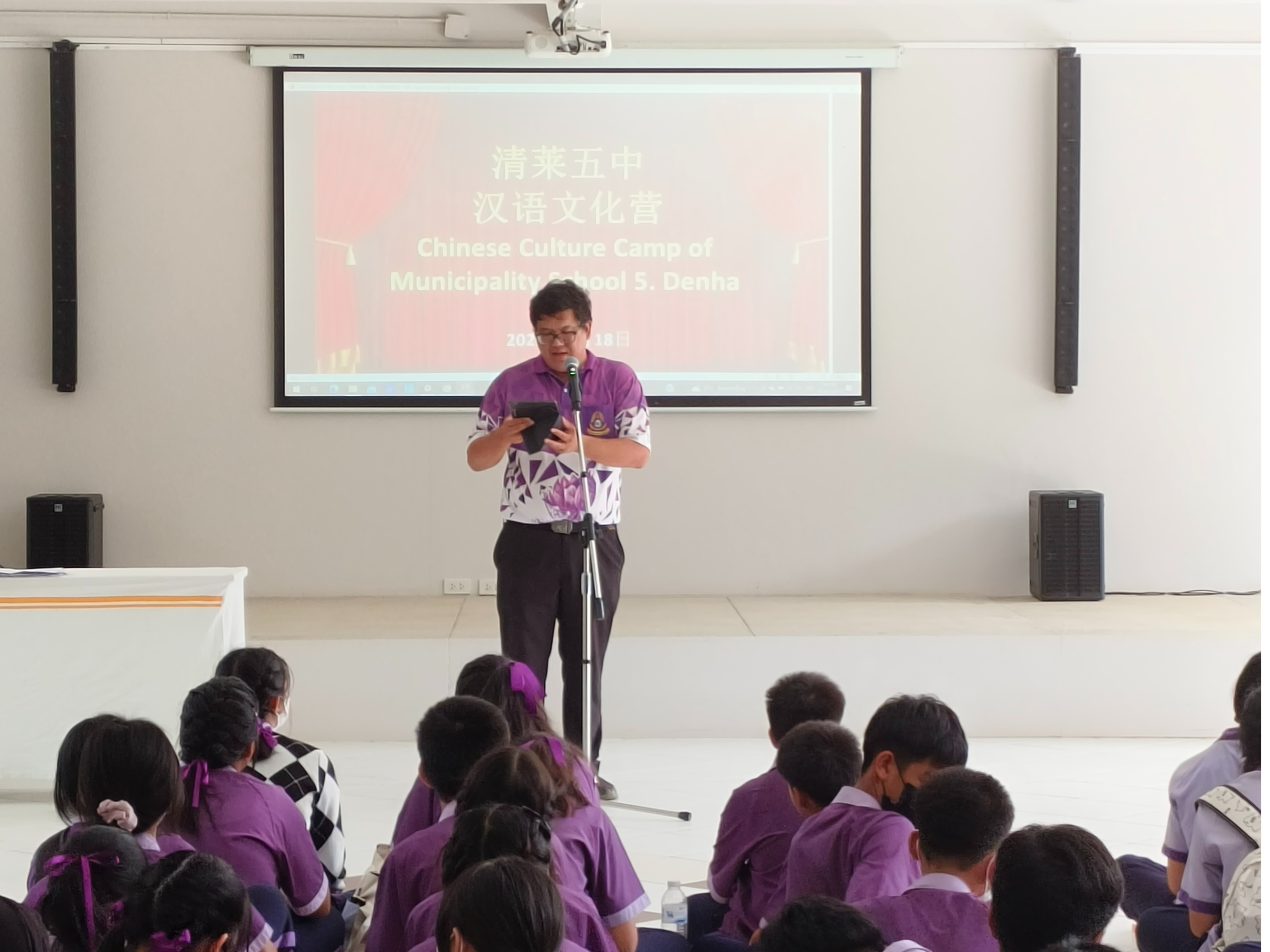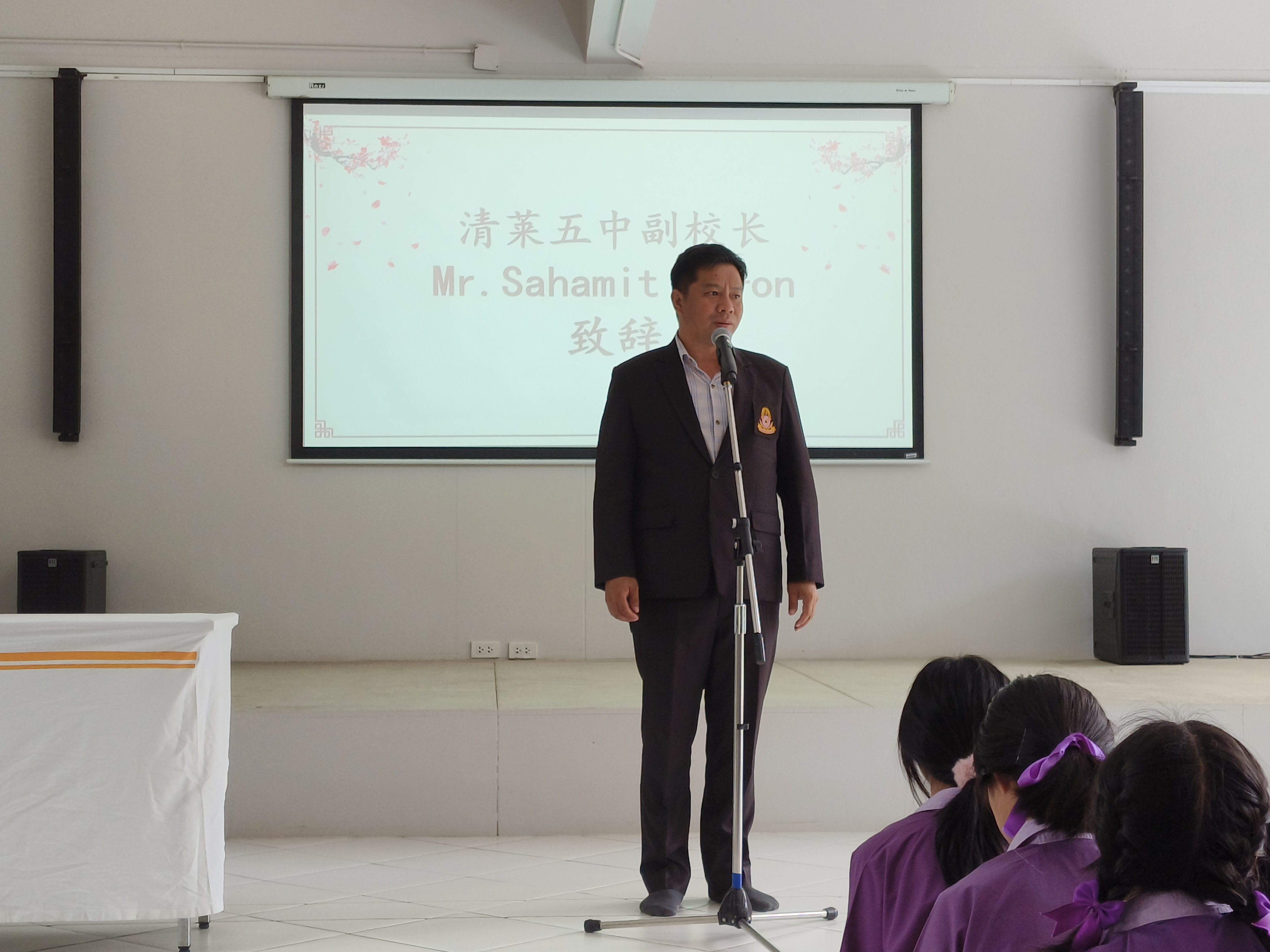 之后,清莱五中副校长Mr. Sahamit Ta-on的发言简洁有力,他指出汉语是目前世界上最重要的语言之一,学好汉语对于学生们将来的人生道路和职业规划都有着极其重要的作用。清莱五中非常重视与孔院的合作,每年都会带学生们来参加各种中国文化活动,激发学生们的学习兴趣。他鼓励学生们要认真参与到各个文化体验活动中,寻找汉语学习的长远目标。最后他对于孔院多年来对清莱五中的支持和帮助表示诚挚的感谢,希望今后双方能够展开更亲密的合作。