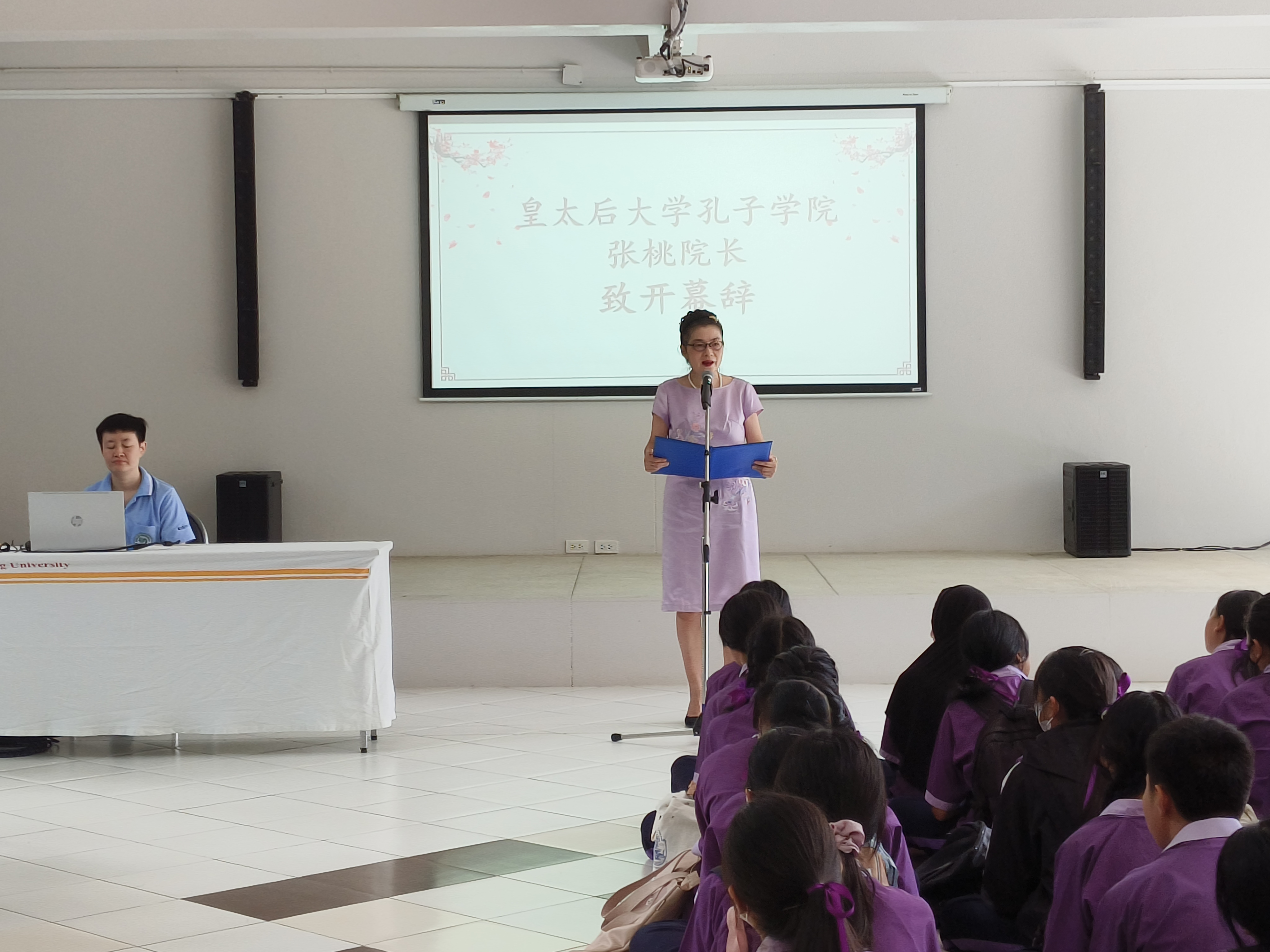 随后,孔子学院院长张桃上台致辞,她首先对清莱五中多年来在汉语教学和中国文化活动方面做出的努力和成绩表示肯定和赞赏。她指出清莱五中是孔院合作时间最长、关系最紧密的教学点之一,孔院愿意为清莱五中搭建中文教育和文化协作的平台,今后与清莱五中在更多领域进一步深化合作。她也希望小营员们抓住这次参加文化营的机会,沉浸体会中华文化的魅力,激发起学习汉语的动力,并预祝此次文化营圆满成功。