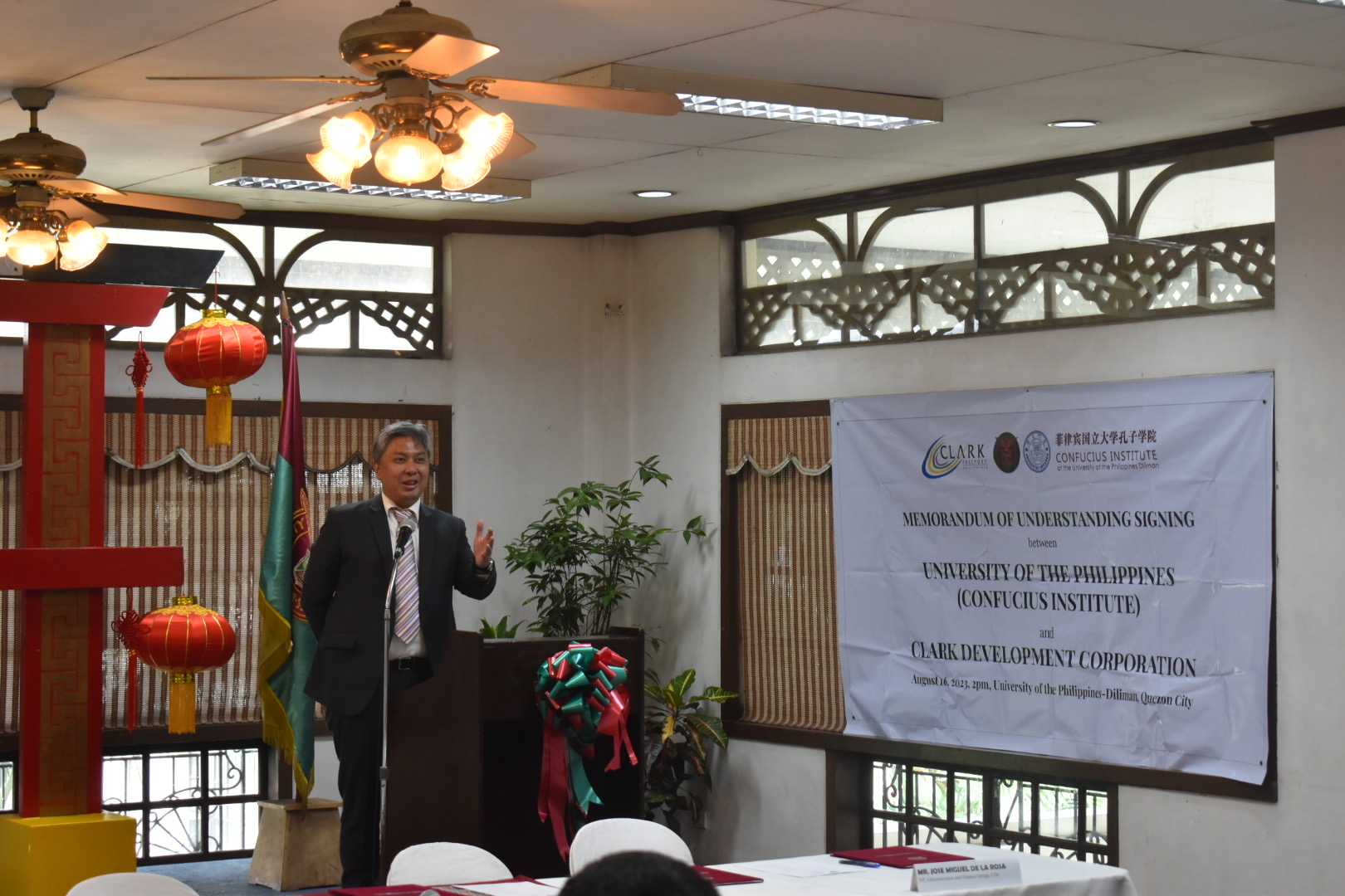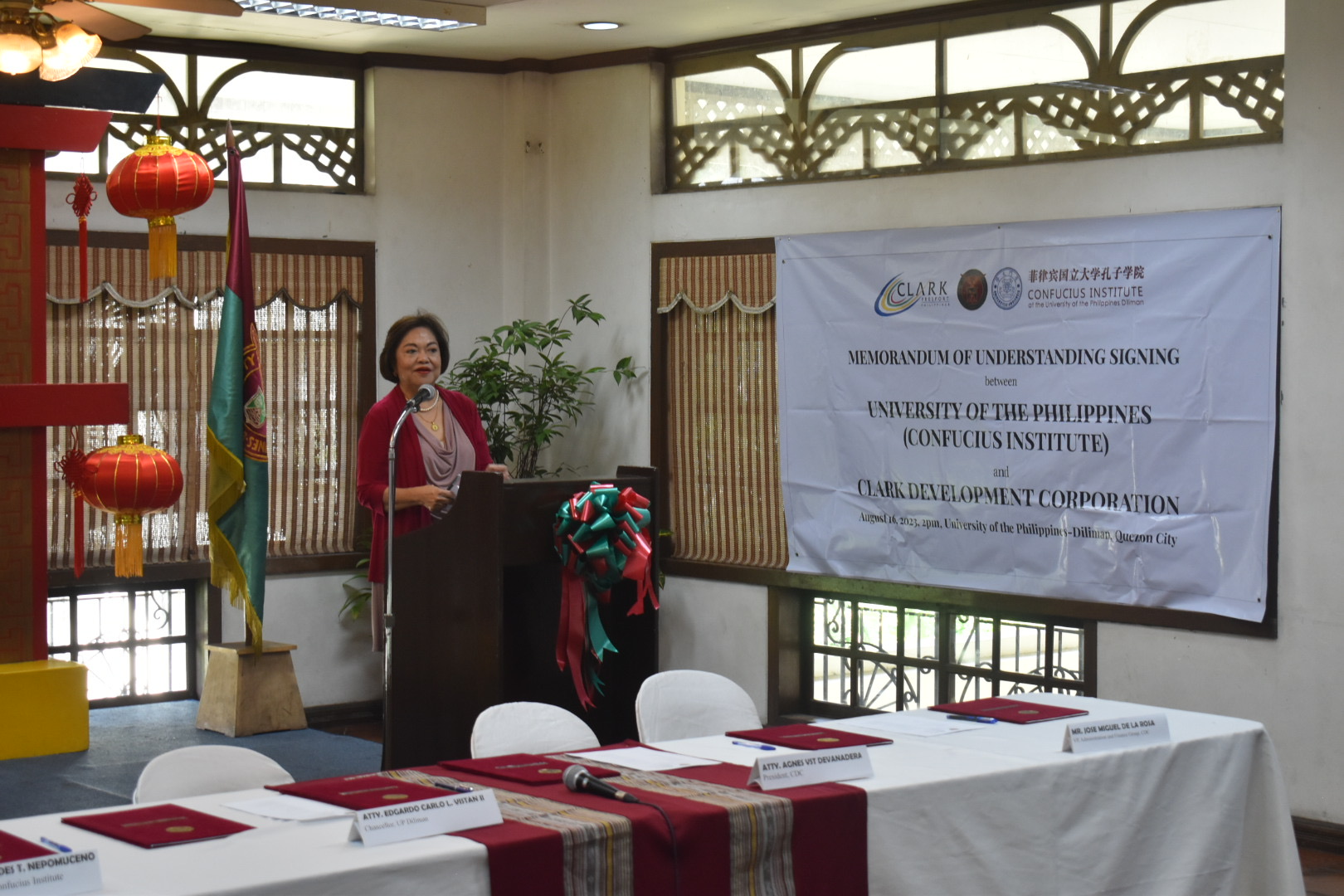 菲大校长Edgardo Carlo L. Vistan II亲临签约现场,并发表了热情洋溢的讲话。他指出菲大作为国立大学,一直致力于通过教育与文化来服务菲律宾社会。他赞扬孔院作为桥梁在推动菲大与菲律宾地方政府、商业机构合作中扮演的重要角色,希望孔院能发挥更积极的作用,促进地方社会经济发展。克拉克发展局主席Atty.Agnes VST Devanadera女士在致辞中强调华人在菲律宾商业中的突出贡献,指出学习中文能进一步增进政府及商业机构与华商的沟通与理解,促进克拉克的经济发展。