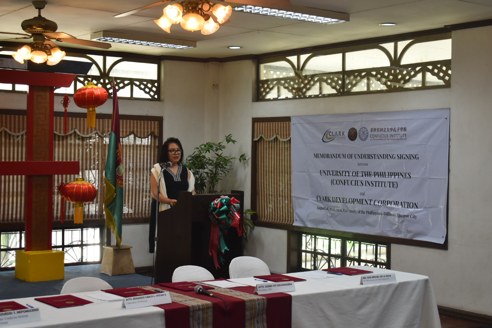菲大孔院致力于在菲律宾推广中文教育与中国文化。菲大孔院外方院长Dr. Lourdes在致辞中阐明了菲大孔院的宗旨与目标,她表示菲大孔院愿意与克拉克发展局加强合作, 为该机构职员提供中文培训,以此促进克拉克的商业与旅游业发展。