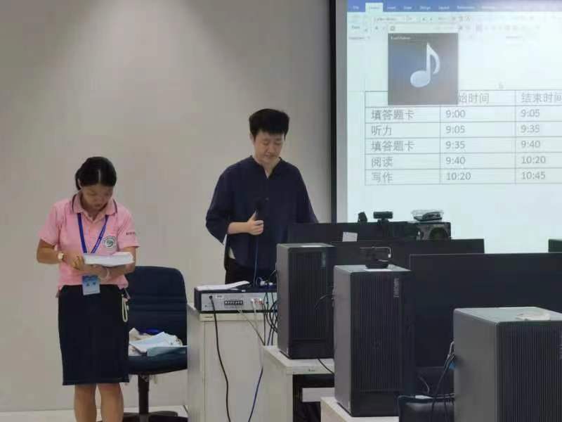 HSKK考场,监考老师们亲自演示了设备操作的流程。期间,主监考老师全程巡视,及时处理考生们的临时状况。考生们高度配合,顺利完成口语机考。