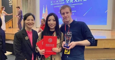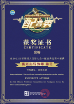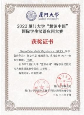 除了在沃辛中学的工作,我还承担了一部分孔院本部的工作。孔院本部布置的教学任务是教授大学生欧文的中文课。2022年7月,我有幸作为指导老师带领欧文赴伦敦参加第二十一届汉语桥世界大学生中文比赛全英大区赛。经过我们共同的努力,欧文参赛表现出色并最终斩获了三等奖和“中英两国文化推广大使”双奖项。这次经历对我来说是一段崭新而又意义非凡的体验,同时也丰富了我的教学与比赛指导经验。此后,我又指导欧文参加了一些汉语比赛并皆斩获奖项:2022年厦门大学“慧识中国”国际学生汉语演讲比赛获得三等奖;第二届华理杯中文大赛获得第二名和最佳网络人气奖双奖;汉语桥全球外国人汉语大会-配音秀全球大赛荣获金奖,我因此也获得“优秀指导教师”称号。学员比赛多次获奖离不开孔院大家庭一直以来的细心筹备和大力支持,单靠自己的一点微薄力量是远远不够的,团队力量才最强大。