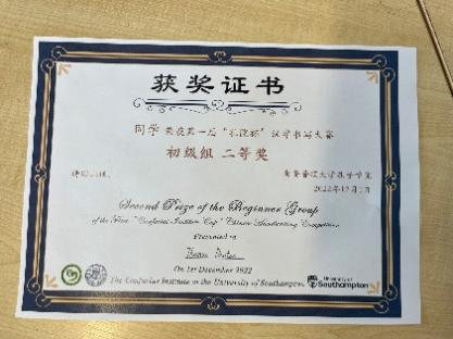 渐渐地,我发现这帮调皮的“捣蛋鬼”开始有了改变,课堂上认真听讲与思考,捣蛋的次数也减少了许多。在后来的会考中,学生们很争气,班级成绩十分优异,有的学生还在2022年第一届南安孔院杯汉字书写大赛中获得了二等奖的好成绩,我心中的成就感和幸福感难以言表。在考完试后的家长会上,有位家长说的话让我印象深刻,他说他儿子最喜欢中文课,而且现在中国社会发展得非常快,很多公司都和中国有业务往来,学好中文对未来个人发展很重要,所以他非常支持儿子将中文选作GCSE的科目之一。