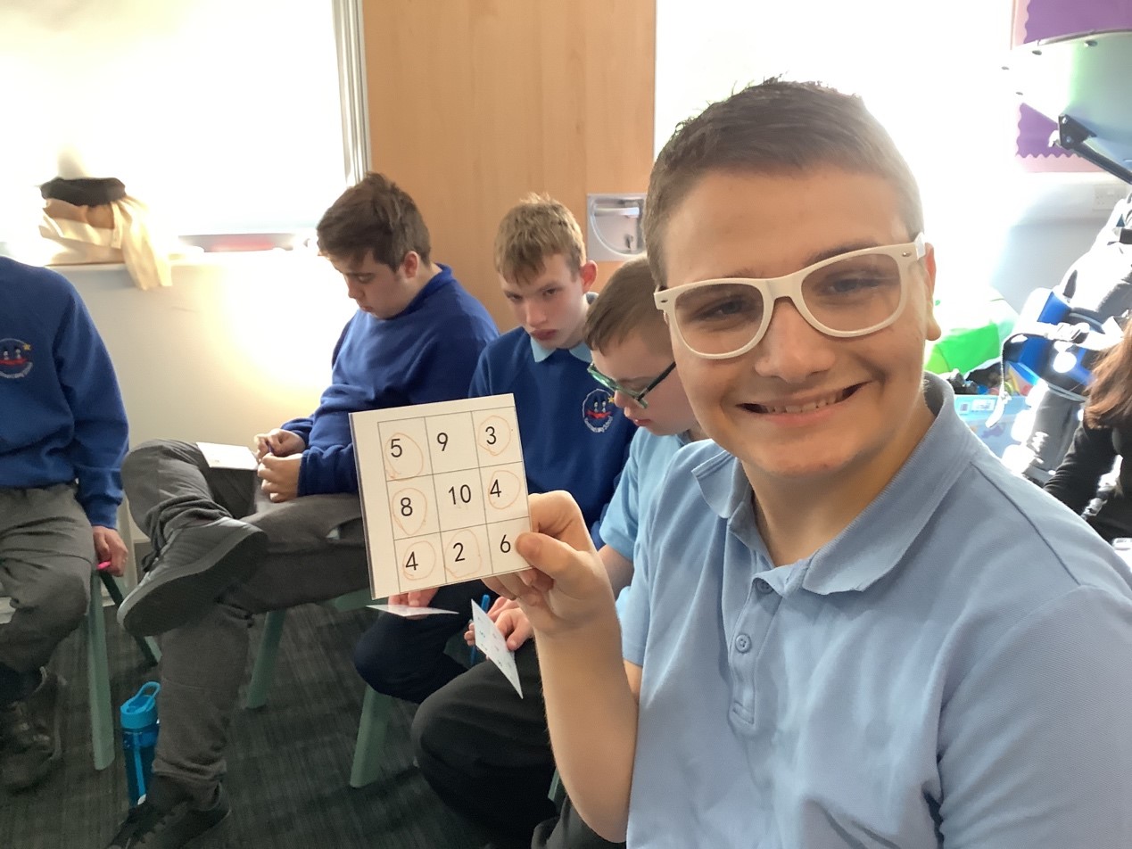 基尔曼斯路特殊教育学校学生向老师展示数字bingo卡牌