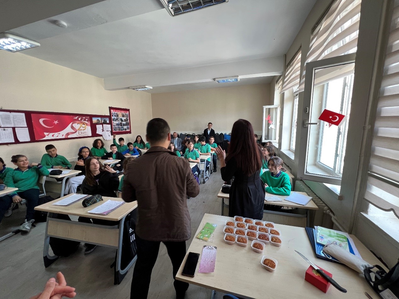 随后,周美芬参赞和吴天喜院长一行,在Köksal Arslan校长和Nermin Selçuk老师的引导下,走进教室,与七年级A班的同学们一起开展了中国传统文化进校园活动之中国传统节日“中秋节”主题课堂介绍活动。孔子学院公派教师李庆首先播放了有关中秋节的视频,然后向同学们进行了讲解,在游戏互动环节,凡是答对问题的同学,都获得了大熊猫贴纸奖励。活动最后,全体师生一起品尝月饼,同学们非常激动,对美味的月饼赞不绝口,一起大声喊出:“中秋节快乐”!