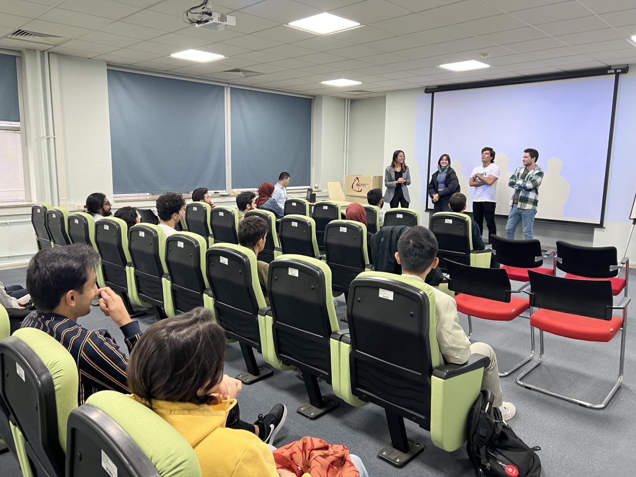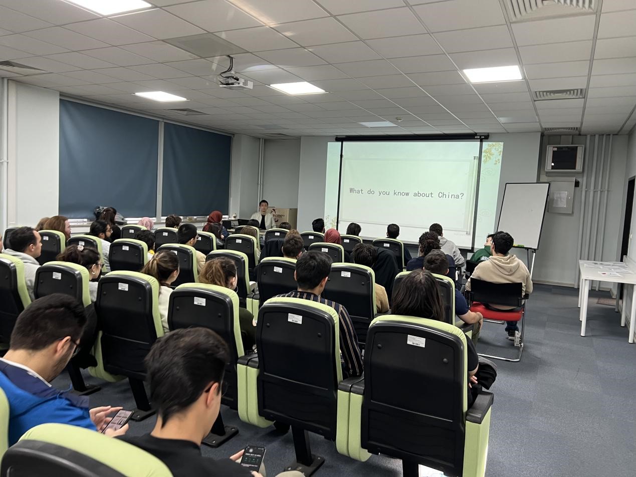 首先,来自北京外国语大学国际关系专业的交换生崔宸硕向学生们介绍了中国的“和”文化,梳理了从古代中国丝绸之路到当代中国“一带一路”的发展脉络,着重阐述了当代中国与土耳其的地缘政治、贸易经济的合作,同时还对学生们的提问做了详细地回答,受到学生们的热烈欢迎。