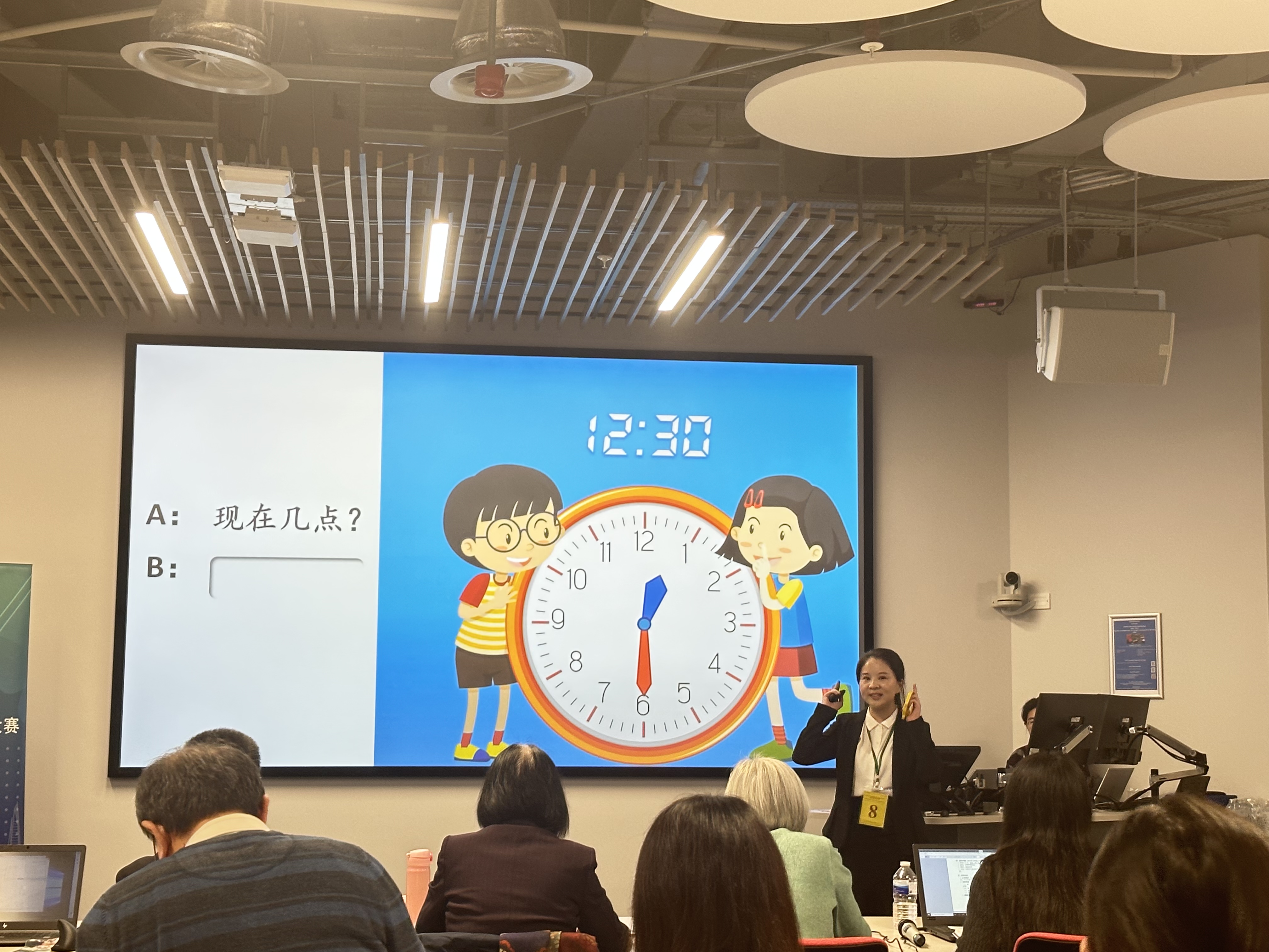 随后,杨梦姣老师作为8号选手出场,其教学主题是“现在几点?”。在正式上课前,杨梦姣老师给学生颁发了进步奖给予学生肯定,并结合Growth mindset理念鼓励学生在学习中文的过程中保持积极的心态。随后杨老师通过带领大家唱《你好歌》正式拉开课堂的序幕。首先,杨梦姣老师运用手势、开火车及一起唱数字歌等多样的教学方法复习了数字0-100,在随后的生词教学中,杨老师用生动活泼的身体动作、有趣的PPT小游戏并结合现代科技,让学生尝试打字、认字、写字,还运用自己制作的时钟指针教具,结合大小声的跟读游戏等,适时穿插了时间表达的教学。最后杨老师在布置作业环节添加了与主题相关的文化内容,让整堂课更加立体完整。杨梦姣老师在教学展示中充满热情,也调动了在场观众的积极性,其丰富有趣的教学方式以及在教学中关注学生成长的新颖思路获得了评委和其他专业老师的青睐和高度赞扬。
