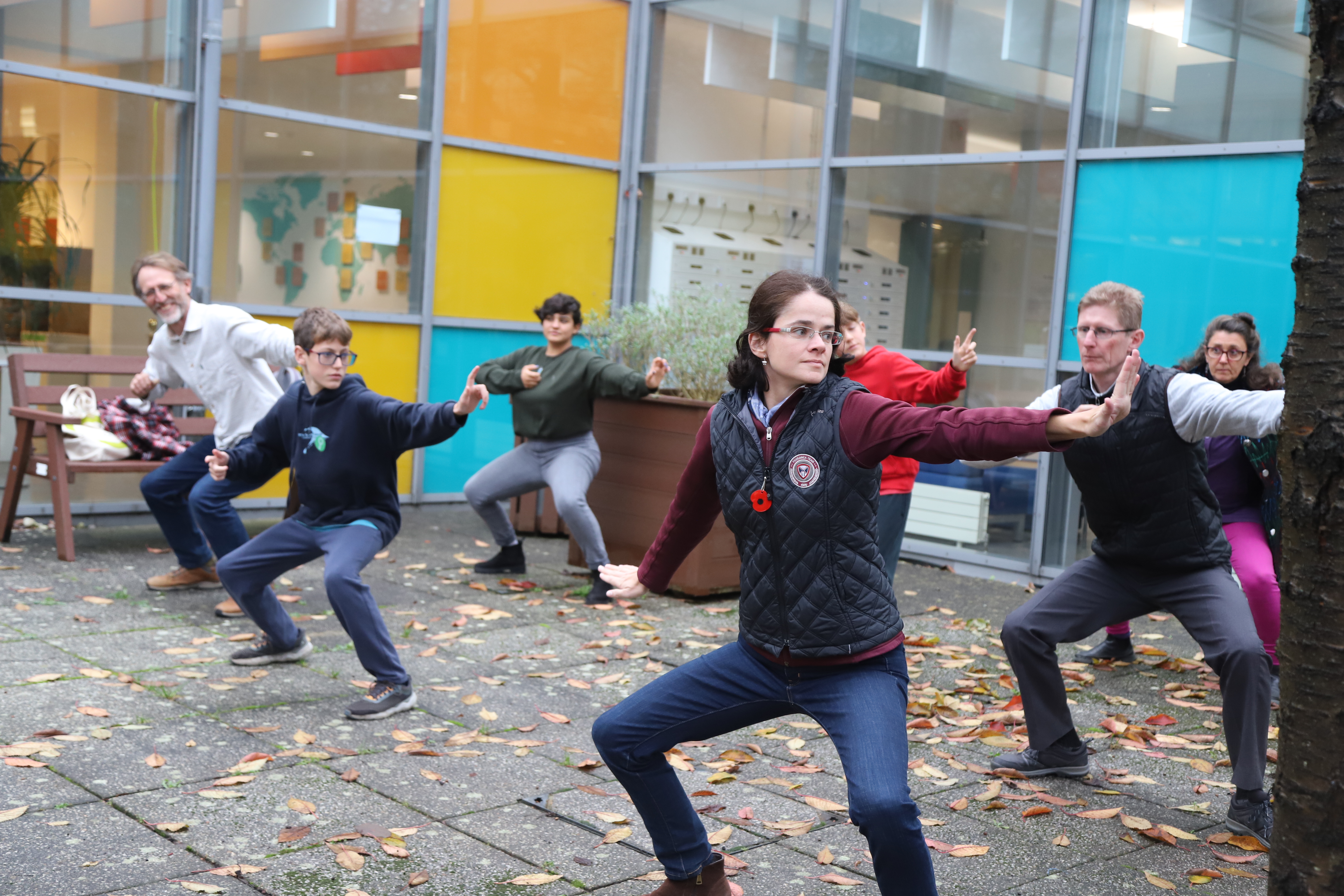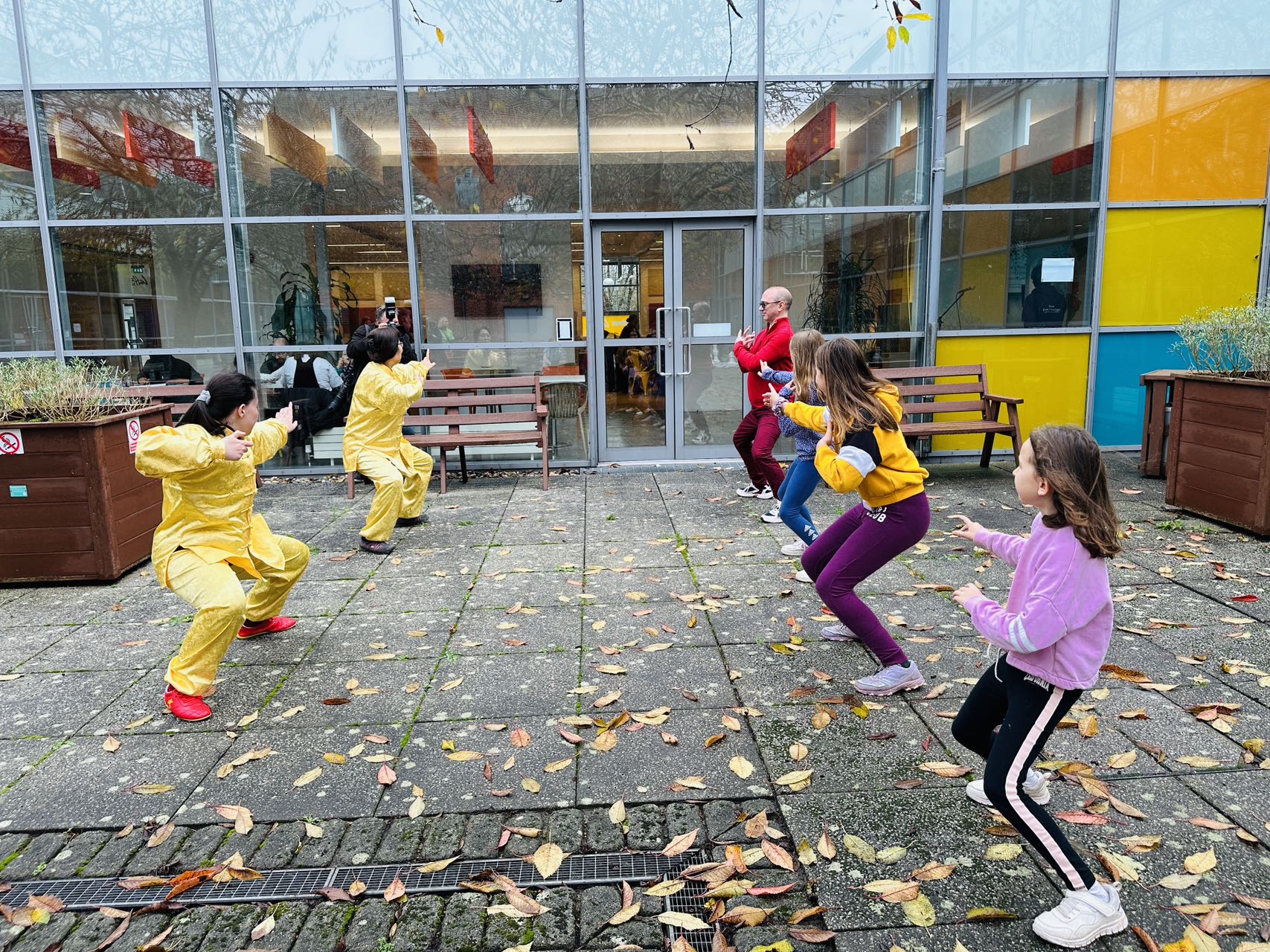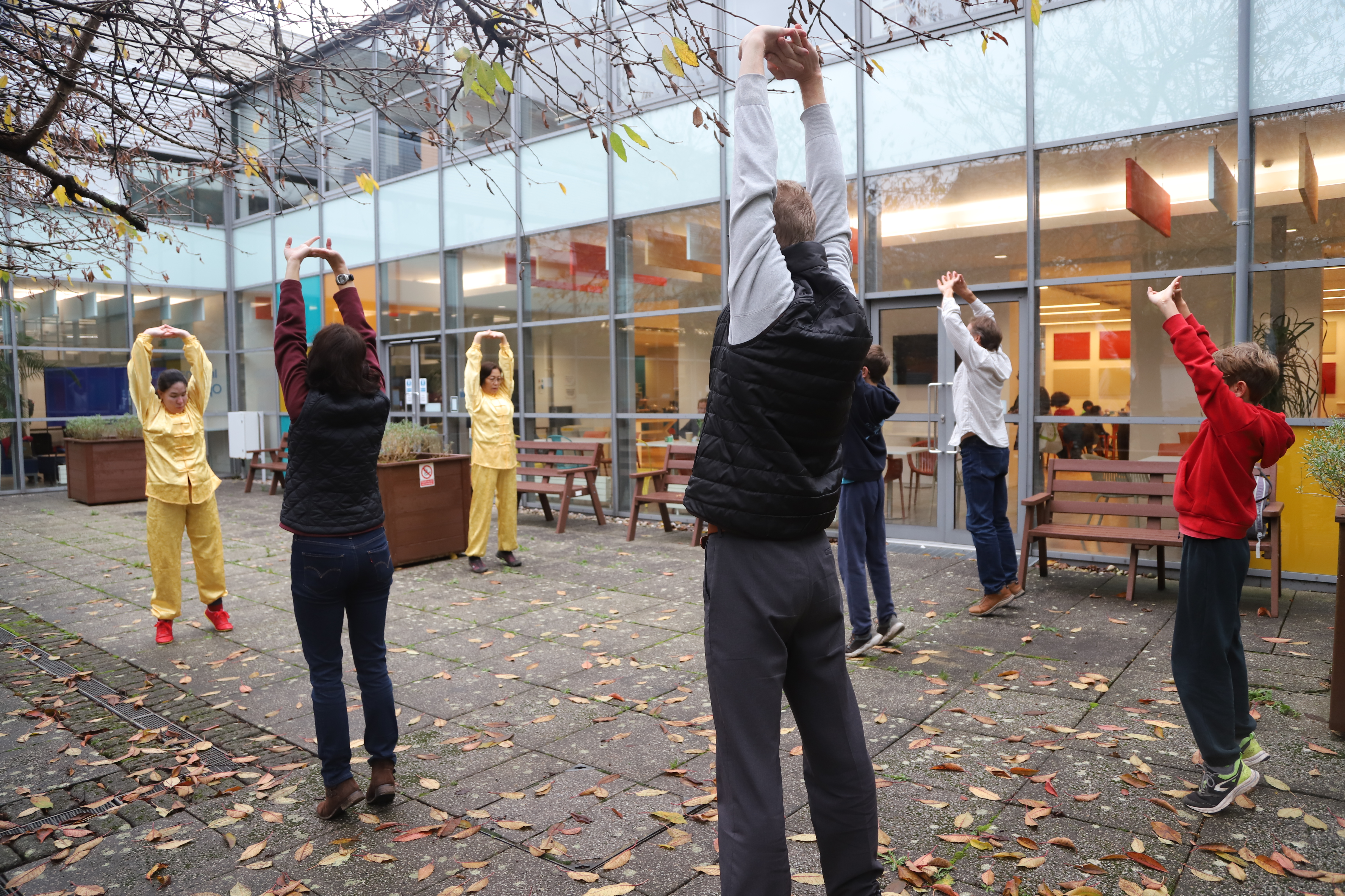 本次体验日,中国气功八段锦工作坊也颇受欢迎。八段锦源自舞蹈,动作舒缓简单,同时也很优美飘逸,是一种老少皆宜的健身方式。深秋时节打一场八段锦可以很好地锻炼身体。在孔院老师的带领下,访客们在一楼中庭练起了中国气功,体验了一番独特的健身方式。