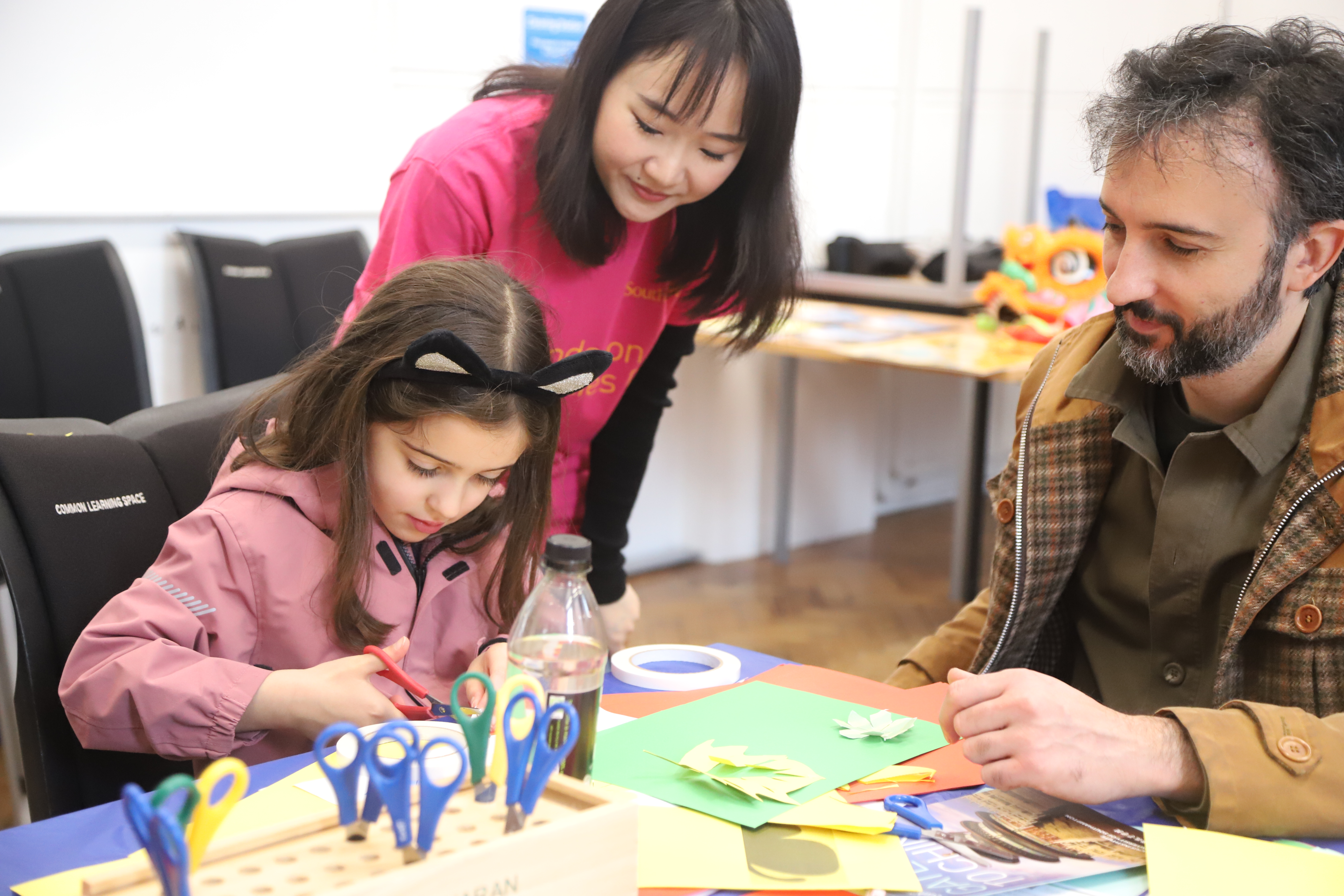 纸上银刀转,巧手夺天工。来到剪纸工作坊的访客们可以零距离体验剪纸这一中国古老的民间艺术。除了欣赏精美的剪纸作品,访客们还能亲自动手剪裁彩纸,制作一份独一无二的剪纸作品。在志愿者的帮助下,一个个具有中国特色的春字、喜字、熊猫等剪纸作品跃然纸上,赢得访客们的纷纷赞叹。有些手巧的访客还根据自己的理解制作出独特的作品,镜头前流露出满满的成就感与自豪感。