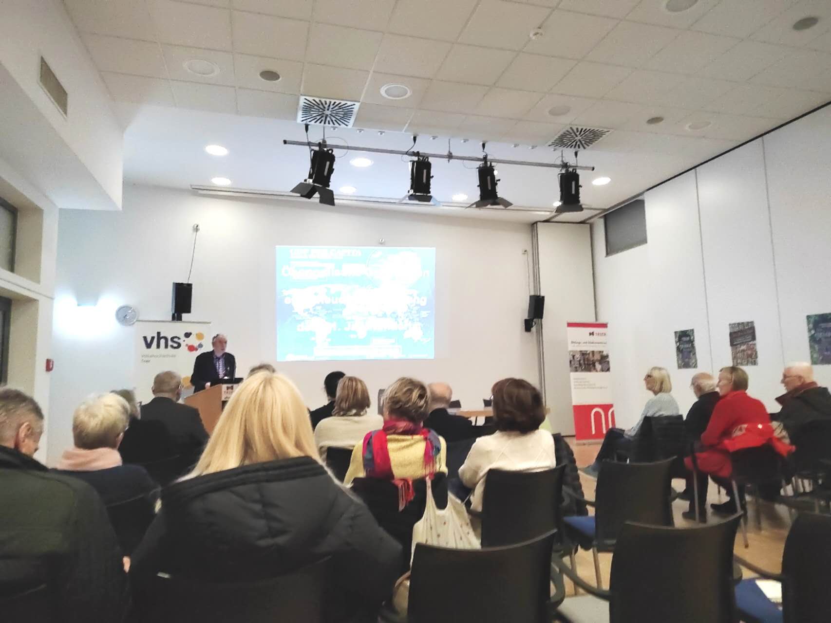 特里尔孔子学院外方院长、汉学家卜松山教授(Prof. Karl-Heinz Pohl)按例介绍了当晚的主讲嘉宾约根·薛尔博士(Dr. Jürgen Schoer)并主持讲座后的讨论。围绕《21世纪新世界秩序的经济基础》主题,薛尔博士介绍了什么是真正的“世界秩序”,它们具有怎样的功能和经济基础。他解释了当前的世界秩序是如何形成的,其形式是什么,以及在未来几十年中哪些经济发展可能会改变世界秩序。由此,他推导出21世纪新世界秩序的可能结构及其对美国、中国、欧盟、新兴国家和发展中国家的影响,并由此提出了中西方未来关系的可能情景。讲座内容丰富,数据详实,引发了观众们强烈的兴趣和积极的讨论,主讲嘉宾也对观众的提问进行了详细作答。