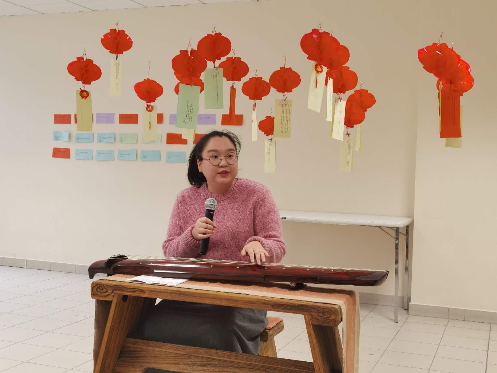 活动开始,蔚蓝海岸孔子学院教师黄瑞玲为大家演奏了古琴名曲《平沙落雁》和《酒狂》。黄瑞玲向大家介绍了古琴的历史和演奏技巧,让学生和老师们能够欣赏这一古老乐器所传达的底蕴和情感,同时还讲述了两个作品的背景,使学生对古琴产生了极大的兴趣并感受到了中国传统音乐的美妙。