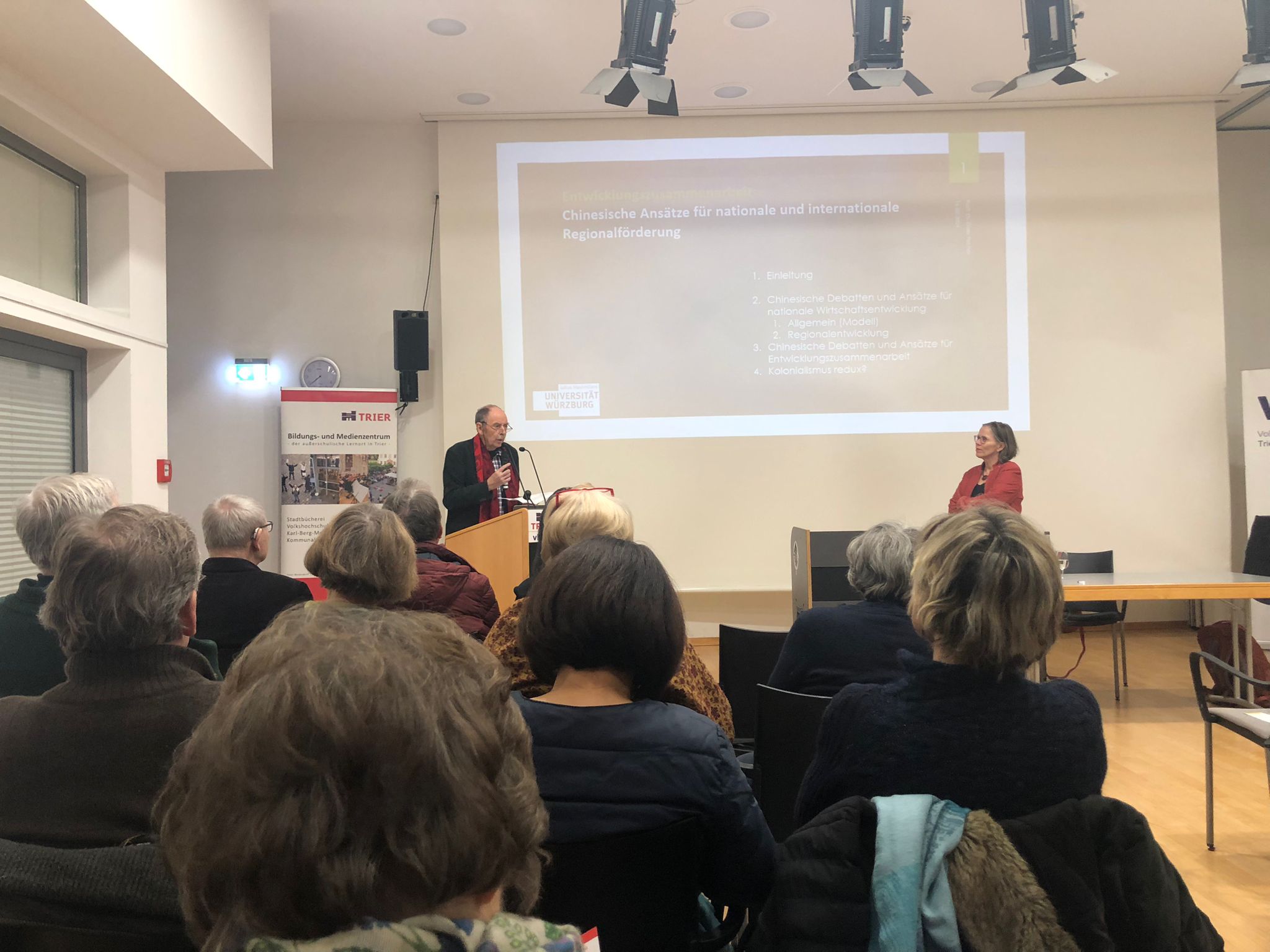 特里尔孔子学院外方院长、汉学家卜松山教授(Prof. Karl-Heinz Pohl)送上新年问候之后介绍了当晚的主讲嘉宾费多丽教授(Prof. Dr. Doris Fischer)并主持讲座后的讨论。当晚的讲座主题是《发展合作——中国提供区域与国际支持的路线》。中国的“一带一路”倡议及其对发展中国家的影响受到广泛关注及讨论,在这个背景下,费教授从另一个角度出发,对中国国内的区域发展战略或伙伴关系进行了调查研究,并尝试探讨其与中国的国际合作之间的联系。讲座独特的视角引发了观众们思考和积极讨论。