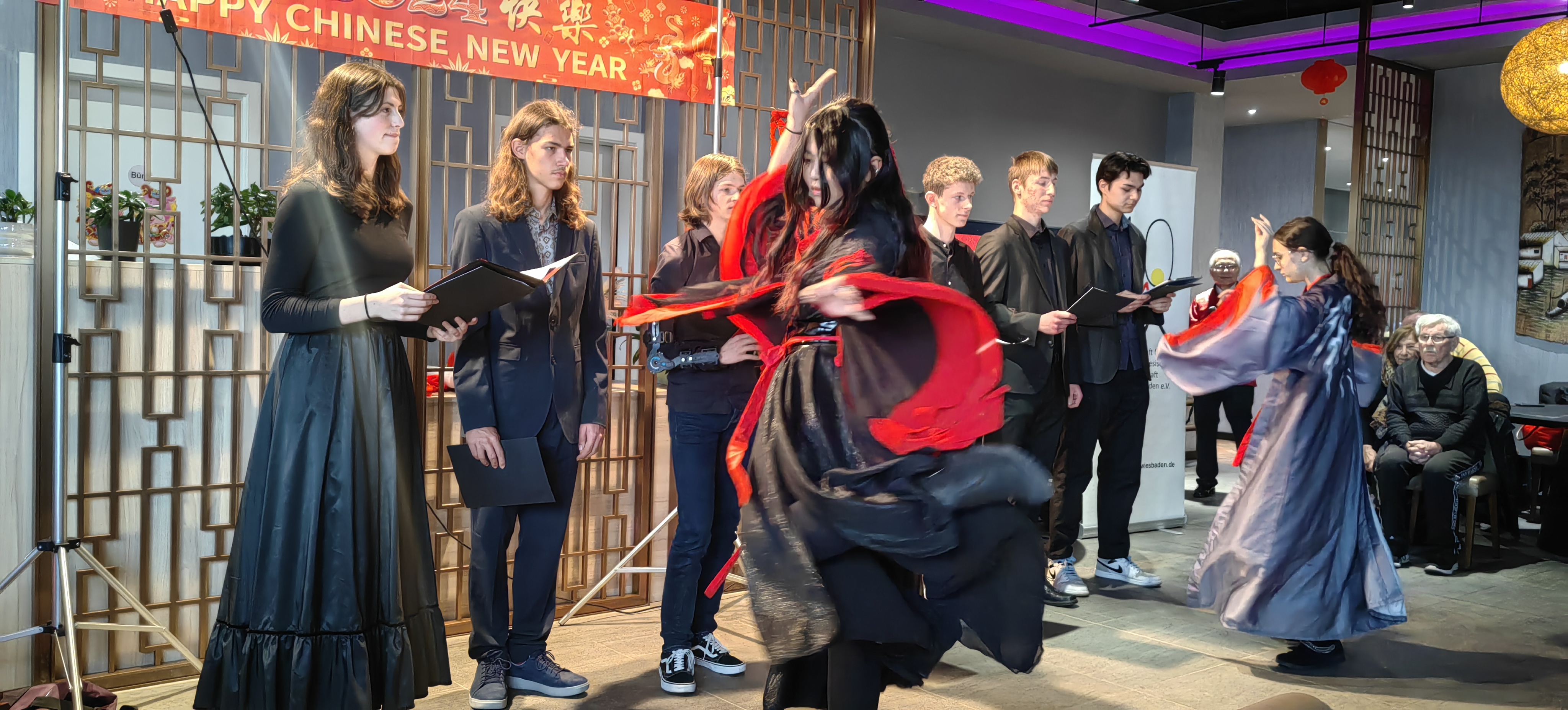 在一曲悠扬的古筝《渔舟唱晚》后,美因茨威斯巴登德中友协会会长卡尔斯特先生致辞。紧接着不同年级的学生们就表演了古诗吟诵《春晓》、律动《如果你感到幸福》,合唱《向云端》和《元日》;OSG高级文理中学的学生们则带来了歌舞《歌声与微笑》和《一剪梅》;其他友华社团也纷纷呈上武术、舞蹈、民乐演奏等精彩的节目。