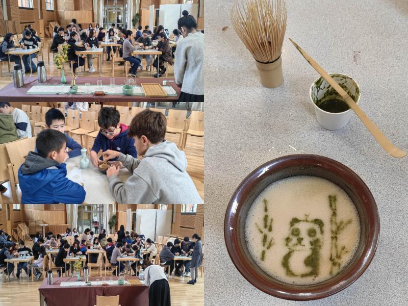 在老师的耐心示范和细致讲解下,学生们仿佛穿越到宋代,有板有眼地开始了“点茶”的学习。在细心温盏、调制茶膏、冲茶后,很快进入了最花力气的打茶泡环节。为了获得完美的泡沫,学生三人一组轮番上阵,用接力的方式努力着。很快各个组传来了惊喜的欢呼,原来第一次尝试也可以将泡沫打得那么细腻洁白。而接下来“茶画”的趣味环节里,同学们更是玩得不亦乐乎,脑洞大开。有人用浓茶膏写下了自己的名字,也有人画了熊猫、小鸟,想象力在方寸间尽情展示。