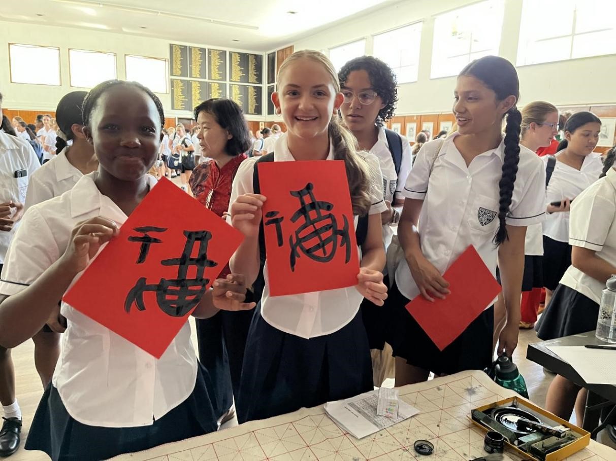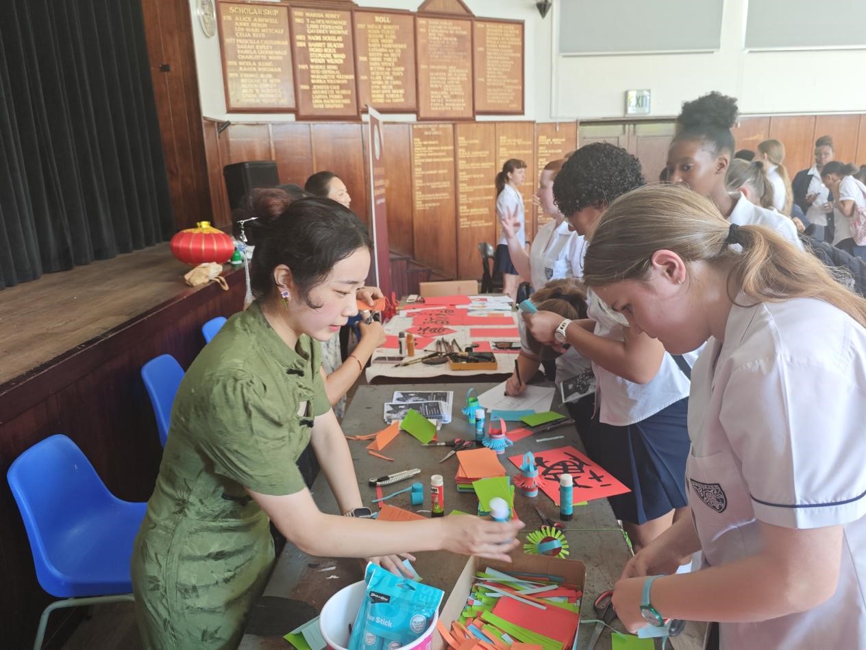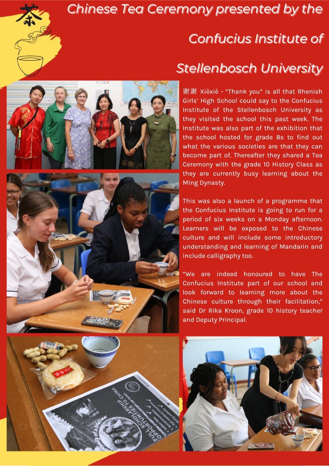 当地时间1月24日,南非斯坦陵布什大学孔子学院应邀参加南非莱茵(Rhenish)女子高中“文化体验日”(Cultural Experience Day)活动。以“笔墨纸砚,品茗观艺”为主题,呈现了丰富多彩的中华文化体验。“文化体验日”活动集中展示了斯大孔院的中文语言课程和丰富多彩的文化活动。在活动中,学生们有机会亲身体验中国剪纸艺术、毛笔字书写“福”字等中式传统技艺,通过互动感受中国文化的独特魅力。