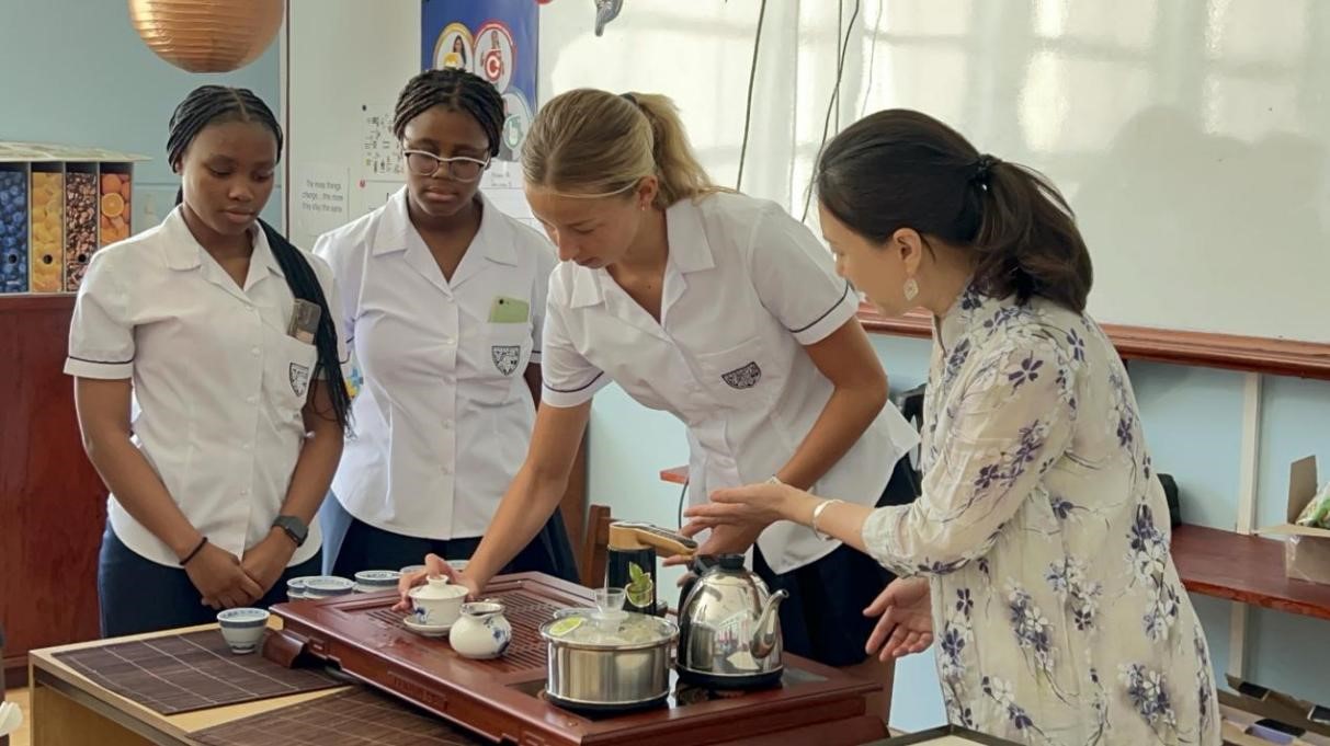 在教室里,一场别开生面的文化之旅也拉开帷幕。在茶艺课程中,学生们不仅品味到不同种类的中国茶,还在茶香幽幽中了解到中国传统茶文化的历史,学习茶道的基本礼仪和技巧。两场专业的茶艺课程,为学生们带来中国茶文化的深刻体验。最后,同学们也亲自尝试泡茶,感受茶艺的艺术性。在这一过程中,学生们展现出对茶艺的浓厚兴趣,纷纷发表对茶文化的独特见解。更有学生表示,通过这次体验,更加了解了中国茶文化的深邃之美。