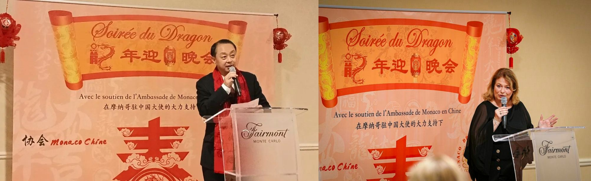 1月29日,法国蔚蓝海岸孔院与摩纳哥-中国协会在摩纳哥驻华大使馆的支持下, 在摩纳哥蒙特卡洛费尔蒙酒店(Fairmont Monte-Carlo)举办了 "龙年之夜 "新年晚会。中国驻马赛总领事董广利受邀赴摩出席龙年迎春晚会。摩亲王殿下办公室主任思戴纳(Christophe Steiner)、驻华大使马思颂(Marie-Pascale Boisson)、外交部对外和领事关系主任卡卢索(Marie-Catherine Caruso-Ravera)、摩纳哥-中国协会主席王晓琴及各界友人80余人出席晚会。