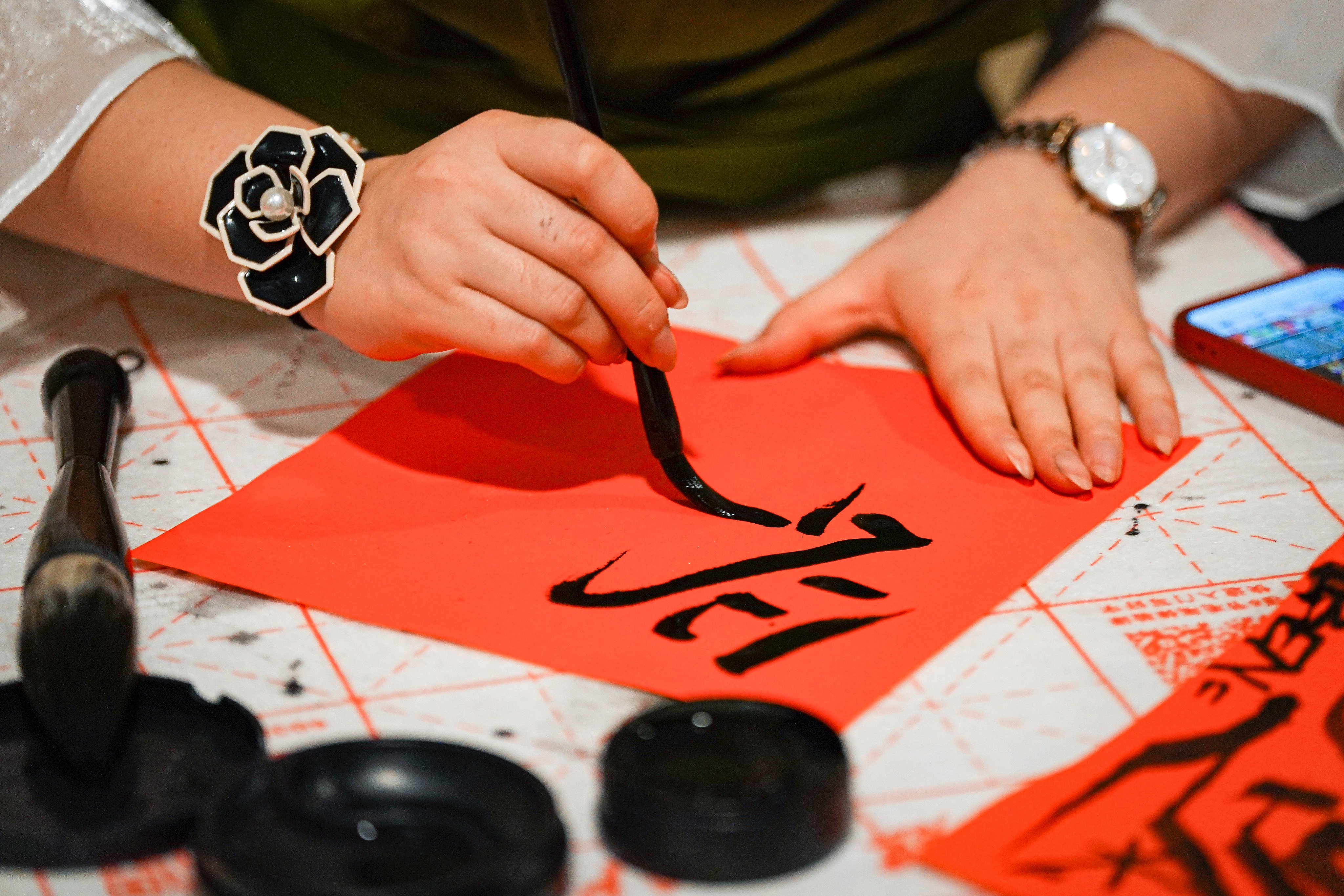 晚会开始前,孔院志愿者崔文瑄为各位大使和来宾们书写了“福”字。现场的书写吸引了众多来宾欣赏,有的参会艺术家选择亲自书写,以体验中国书法的乐趣。除了这些寓意美好的汉字,志愿者也应来宾要求书写他们的生肖、名字等汉字,让来宾在领略中国书法魅力的同时,感受浓浓的“年”味儿。