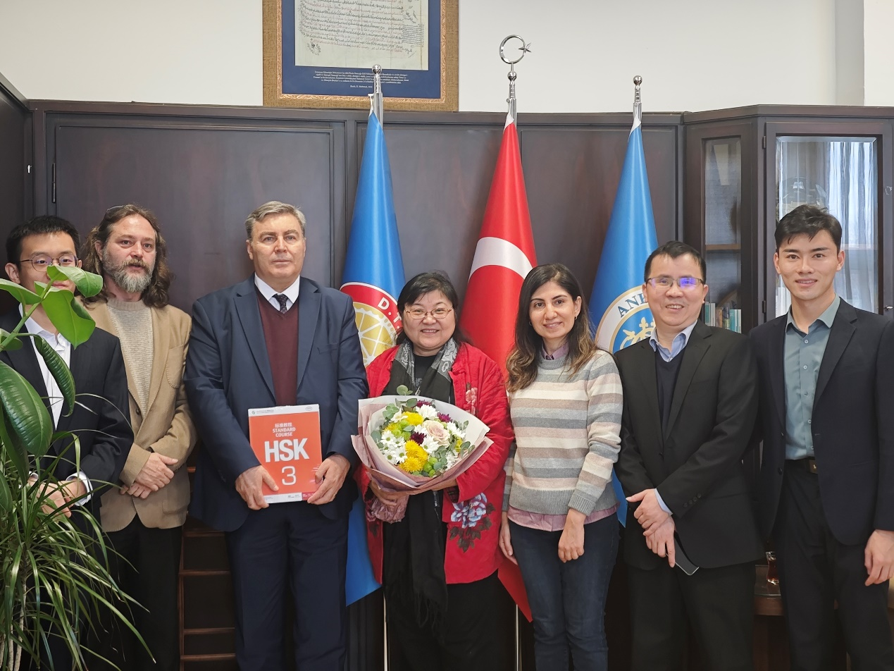 当地时间1月19日,中国驻土耳其大使馆文化参赞周美芬和中东技术大学孔子学院中方院长吴天喜一行七人参访安卡拉大学史地文学院。史地文学院院长莱文特·卡亚皮纳教授(Levent KAYAPINAR)和汉学系主任居尔汗·基里伦教授(Gürhan Kirilen)与来访嘉宾举行座谈,双方就未来加强中文教育合作、与中国高校开展联合培养本土中文教师等项目进行商谈。周美芬参赞代表中国驻土耳其大使馆向安卡拉大学汉学系赠送中文书籍及文化用品。