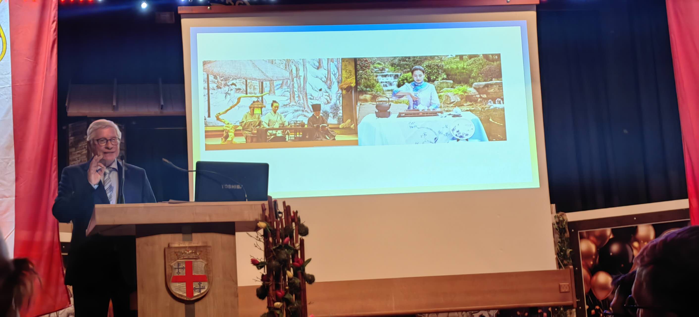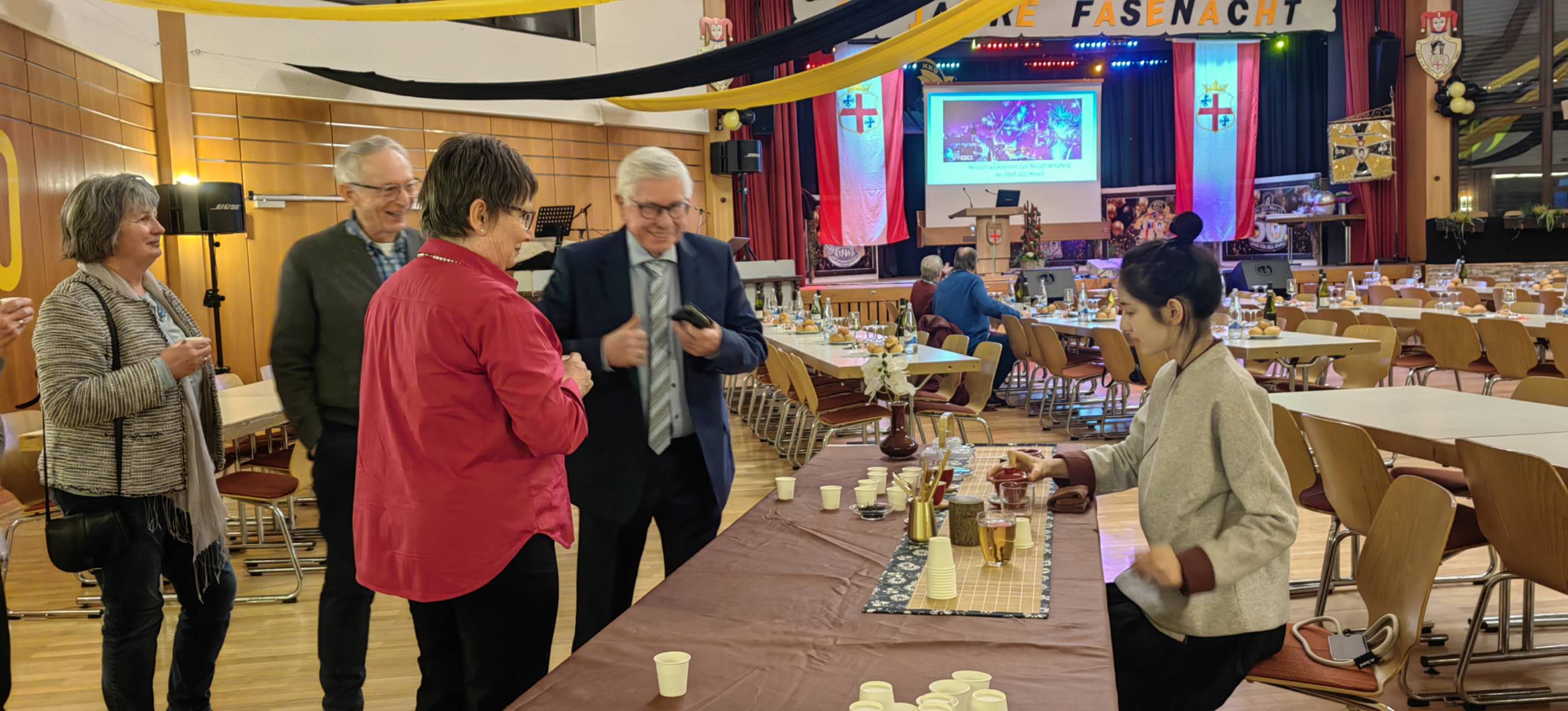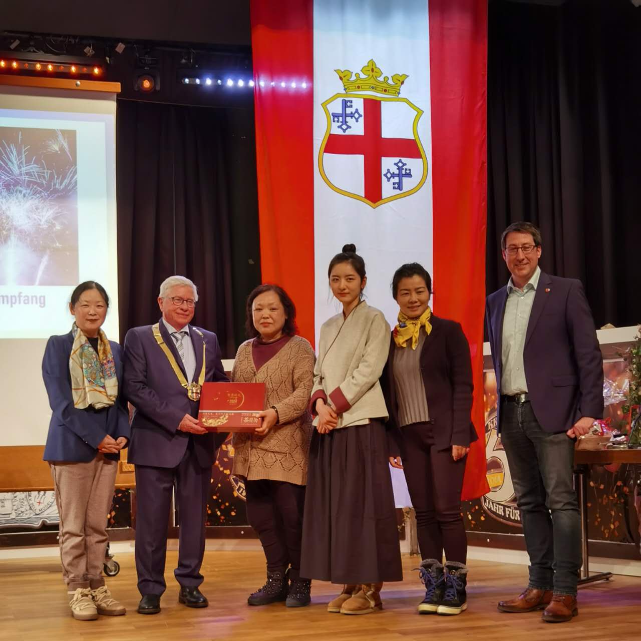 当客人全部入座后,市长登上主舞台。他结合照片介绍了今天茶艺活动并欢迎了中国的客人,全场报以热烈真挚的掌声。随后特里尔孔子学院的院长也受邀介绍了孔子学院,并邀请大家参加近期的活动。冰雪挡不住热情的相遇,以茶为媒 ,摩泽河旖旎,中国奇妙夜正在上演。