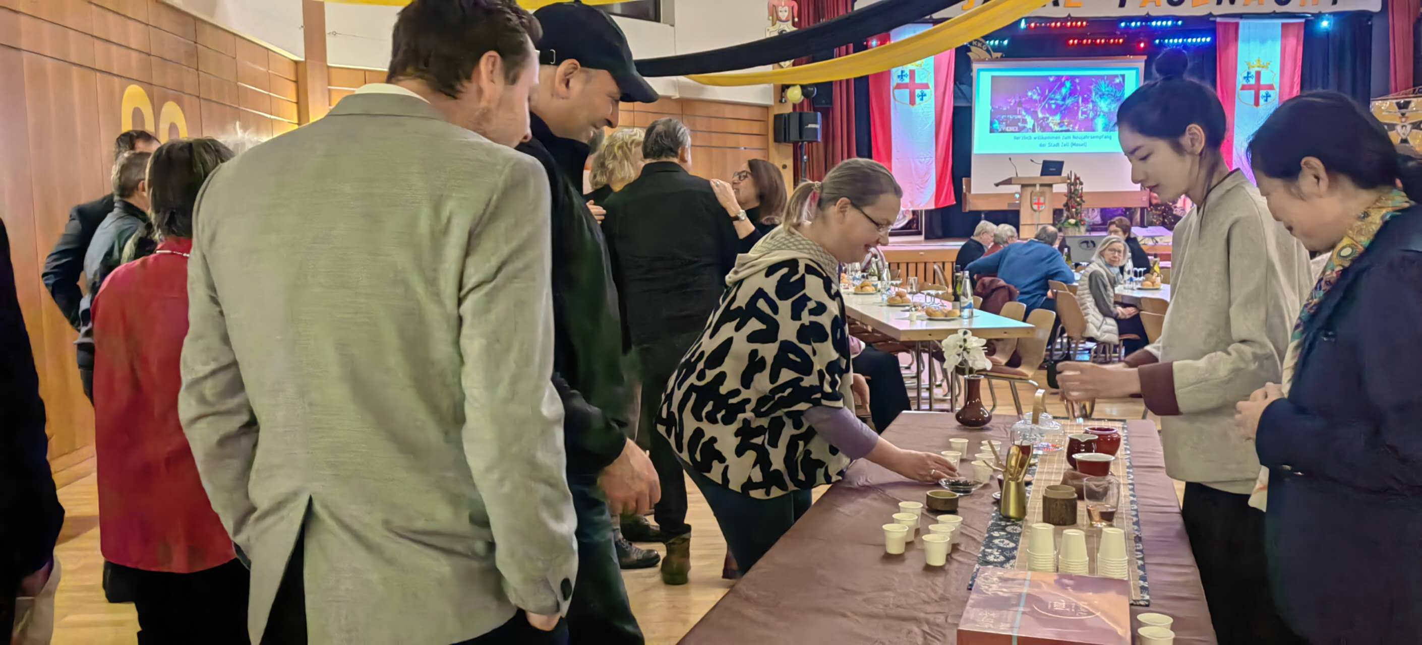 摩泽河畔采尔市是一个产酒名镇,以“黑猫守卫葡萄酒”的传奇闻名。新年活动就在知名的黑猫大礼堂举行。为了本次远道而来的客人今年的新年活动的宣传图就用了茶艺师的照片,早早预告神秘的东方佳茗的到来。而中国国家茶叶博物馆同样认真准备,为了这次欧洲巡讲巡展活动,两位茶艺专家不远万里从杭州带来了各品类最高品质的茶叶和全套茶具,在大厅的入口区域布置好茶艺展示台并准备好三种香茗迎客。每一位到场的嘉宾都先饶有兴味地在茶台驻足,边品饮边和询问,而专家也耐心细致地讲解每种茶的产地、风味和冲饮方式,详谈甚欢。