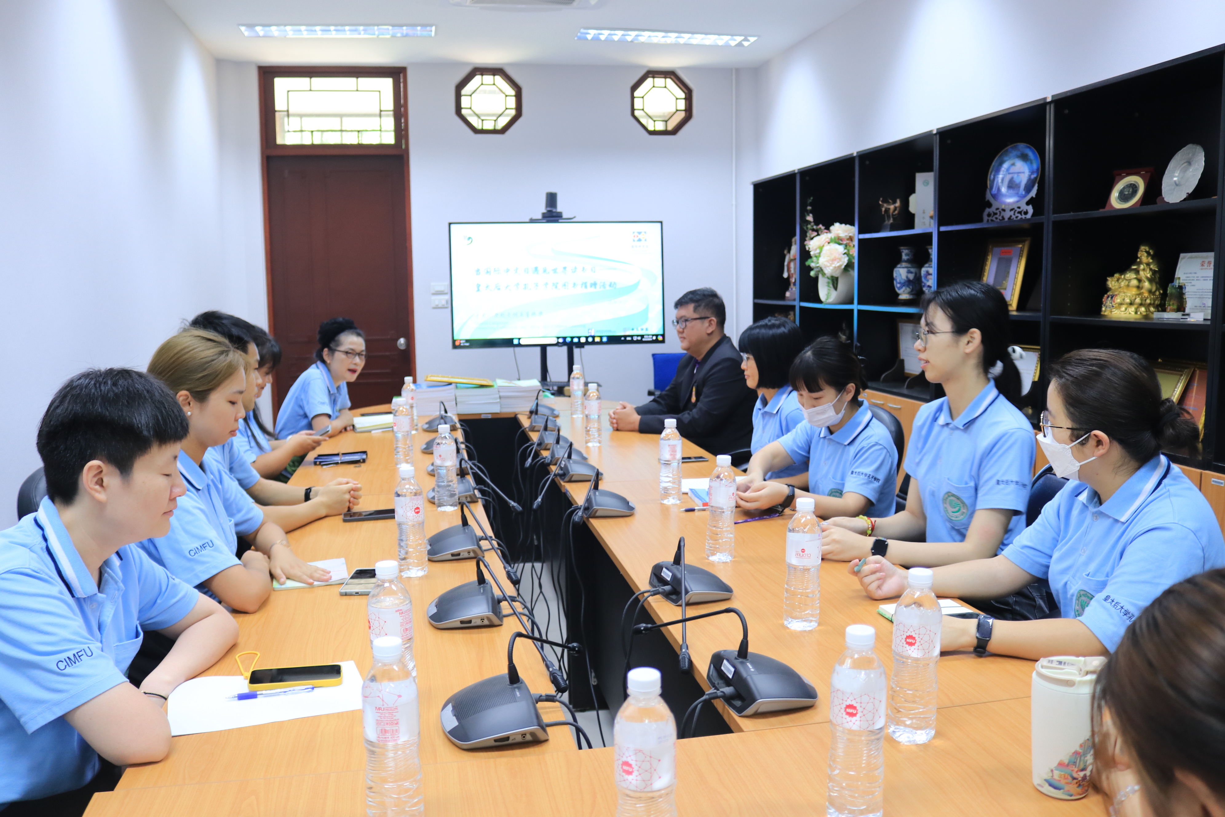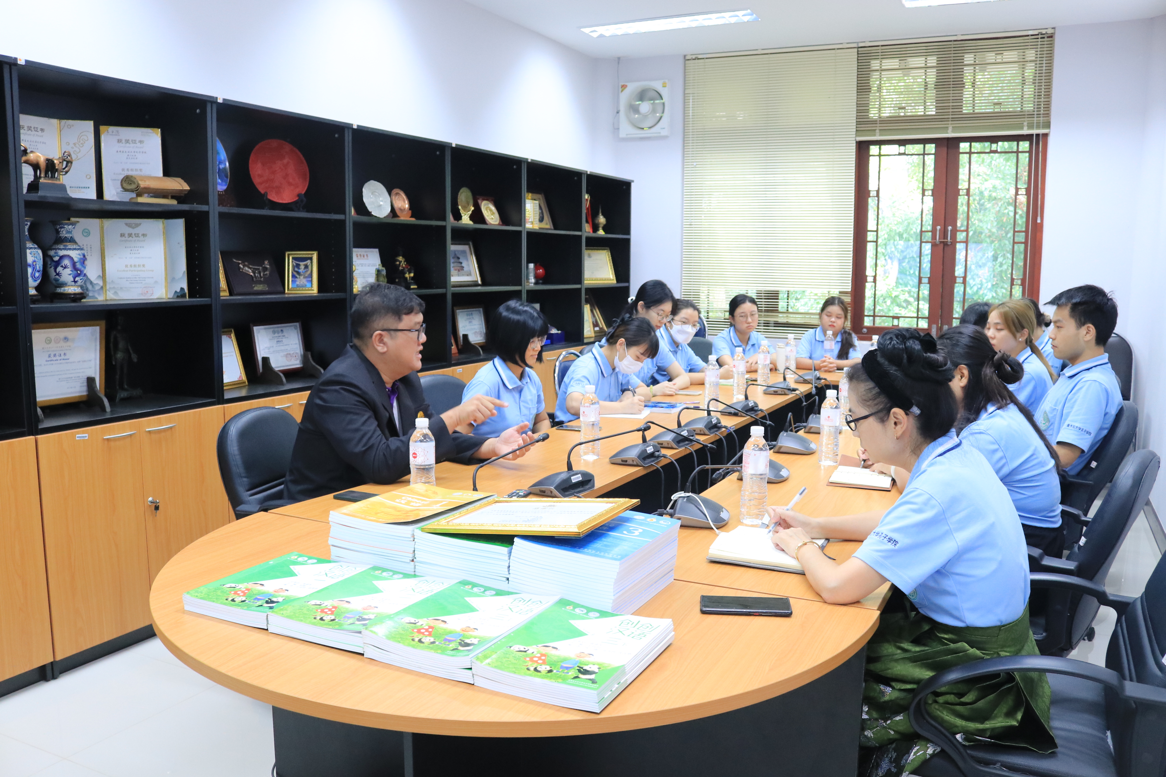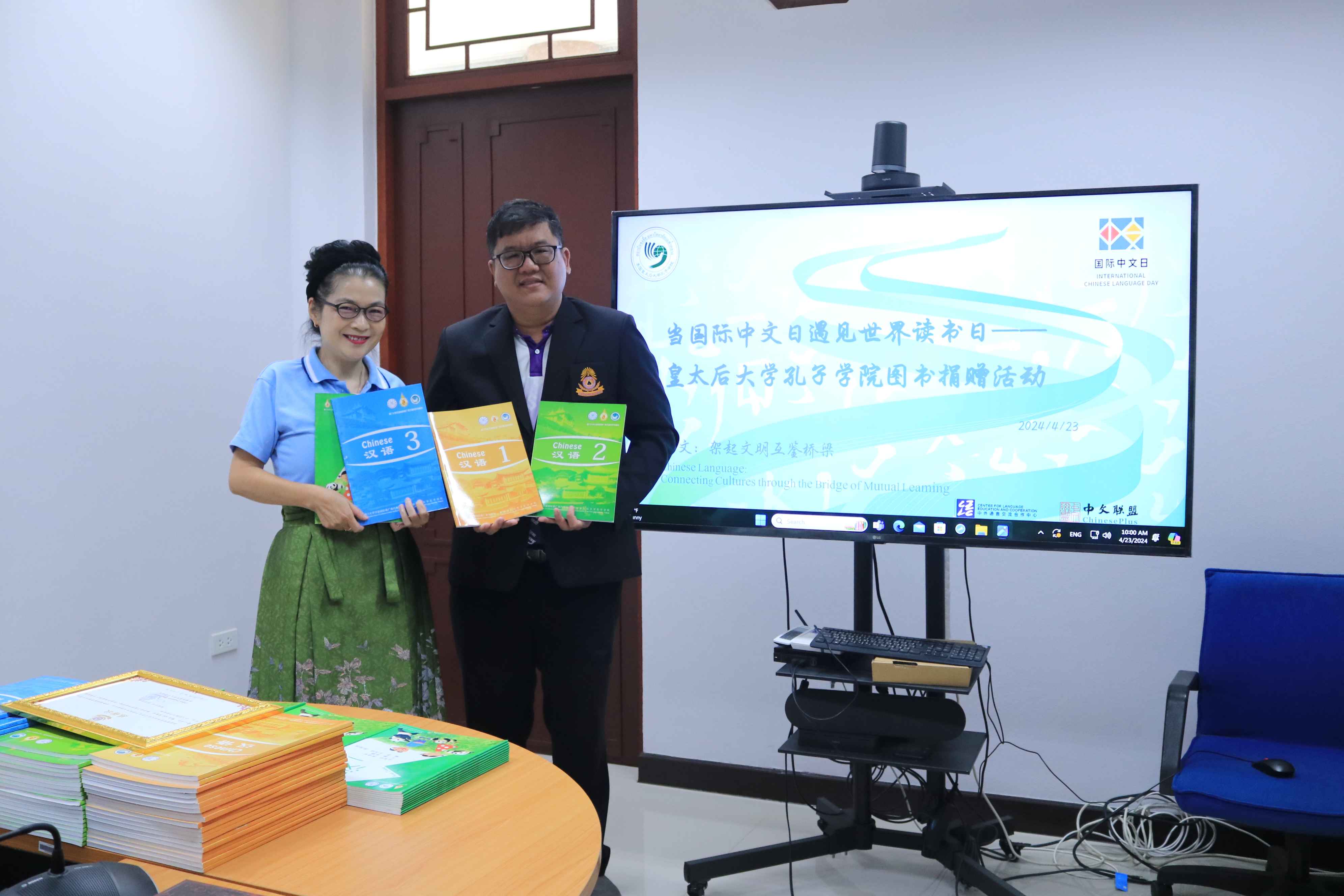 会议由孔院中方院长张桃主持,她表示4月23日是英国大文豪莎士比亚和西班牙伟大作家塞万提斯的辞世纪念日,也是向书籍及其作者致以敬意,并鼓励每个人去阅读和思考的节日。而皇太后大学孔子学院一直在教育、文化上为清莱五中等教学点提供支持,借此契机,孔院向清莱五中赠送自编教材并邀请五中中文教学带头人林金加老师,与孔院教师们一起交流教育和阅读的感受。