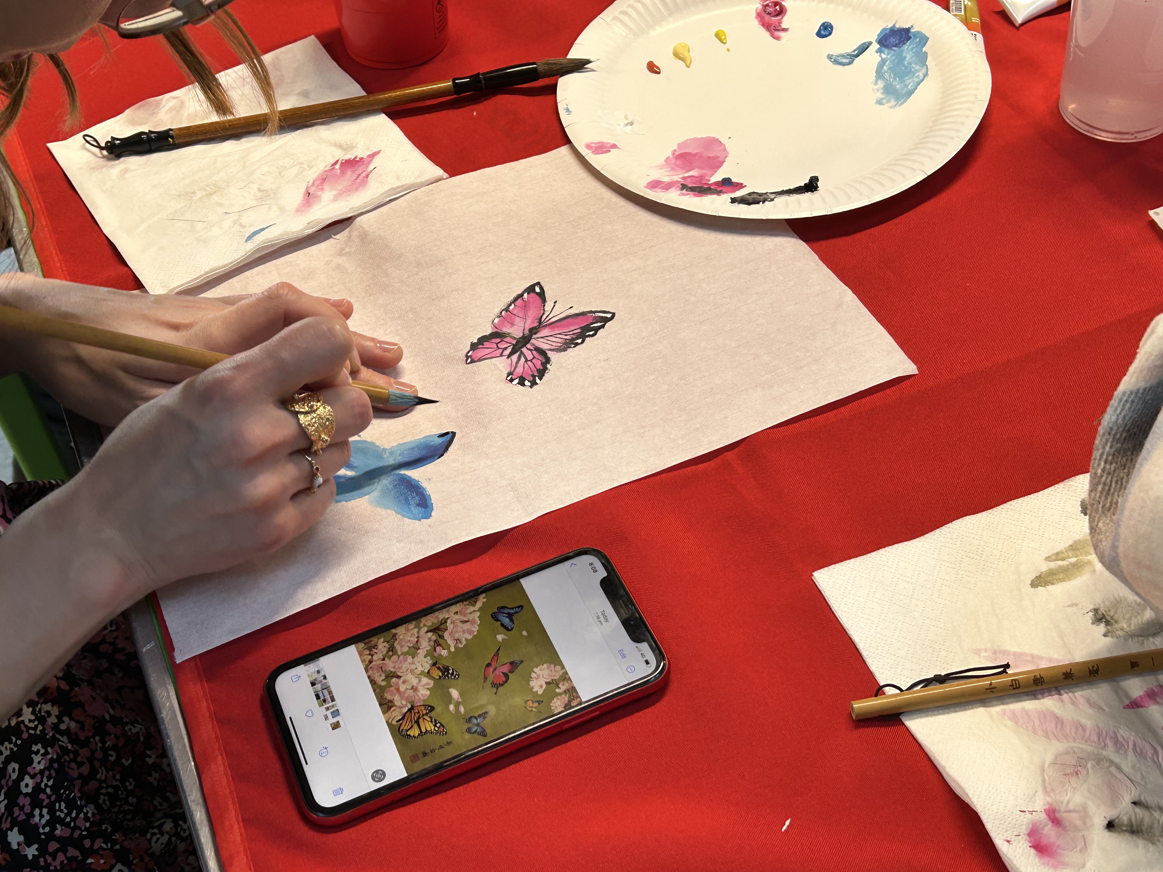 6月18日第三次国画课,教师介绍了国画中动静结合的表达,及蝴蝶、蜜蜂、蜻蜓的画法。同学们在老师的指导和鼓励下逐渐变得自信,也逐步掌握绘画技巧,笔下画出一只只栩栩如生的美丽蝴蝶。