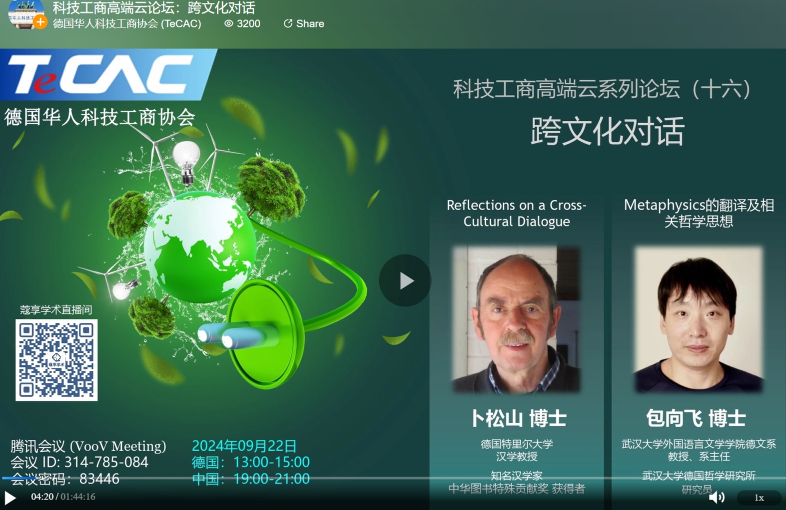 德国时间 9月22日下午,特里尔孔子学院外方院长卜松山教授与武汉大学外语学院副院长包向飞教授一起举办了主题为“跨文化对话”的在线论坛,本次论坛由中方院长李毅主持。