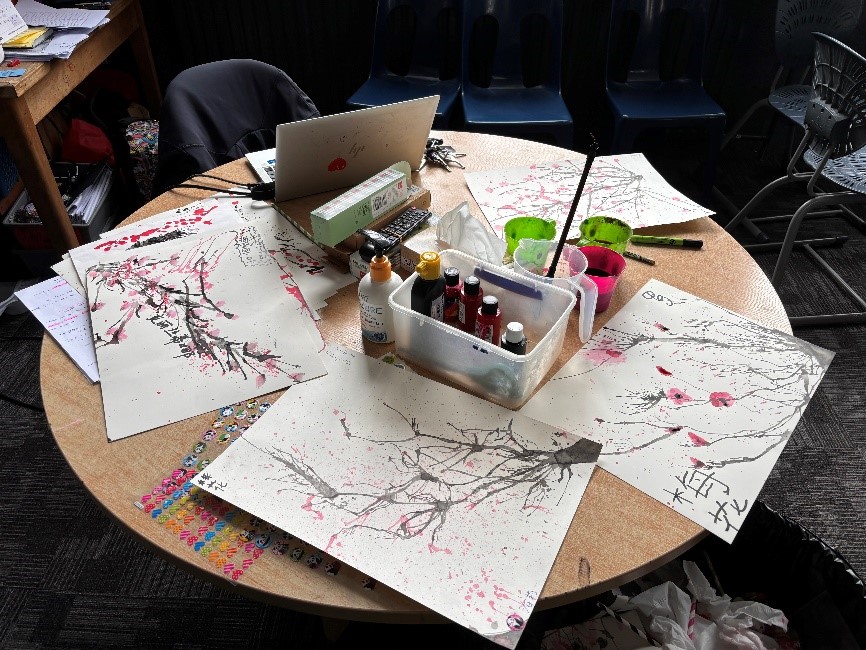 在绘画版块,国际中文教育志愿者王思尧选择了简约而不简单的“吹墨梅”活动。吸管吹墨的另类绘画方式不仅吸引了每位学生都投入创作,也让老师们跃跃欲试,不时能看到师生共作一幅画的景象。