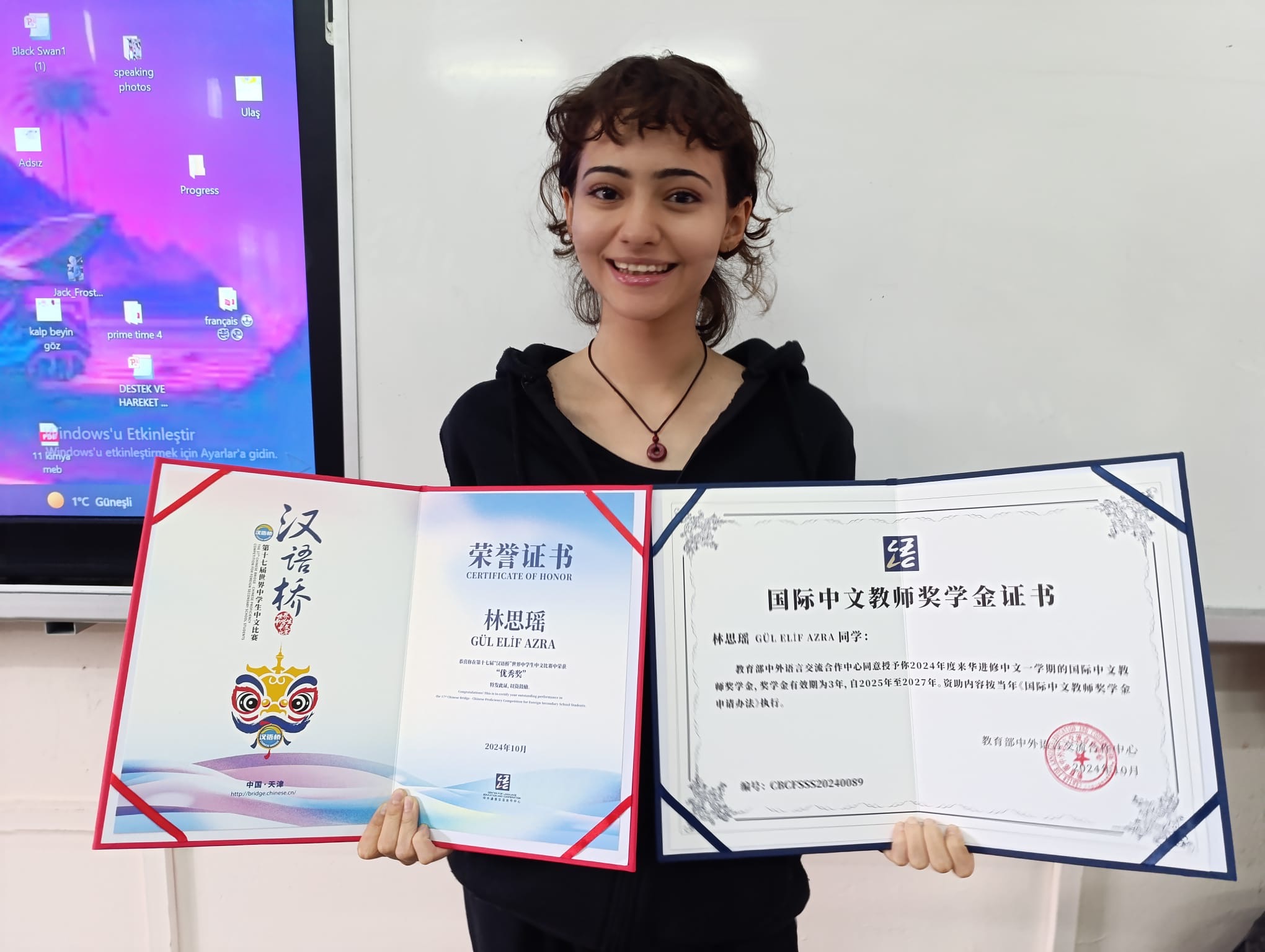 Elif Azra Gül是一位中文学习爱好者。她平时喜欢听中文歌曲、观看中国电视剧,并与几位中国朋友时常保持联系,这使得在行前她已经对中国文化有了初步的了解,并希望通过比赛进一步提升自己的中文水平。比赛结束后,Elif Azra Gül表示,获得“国际中文教师”奖学金是对自己中文学习的认可,也是她未来学习规划的重要一步。她打算继续学习中文、参加HSK考试,为未来能够申请中国的大学做好准备,或利用奖学金在大学期间赴中国深造。