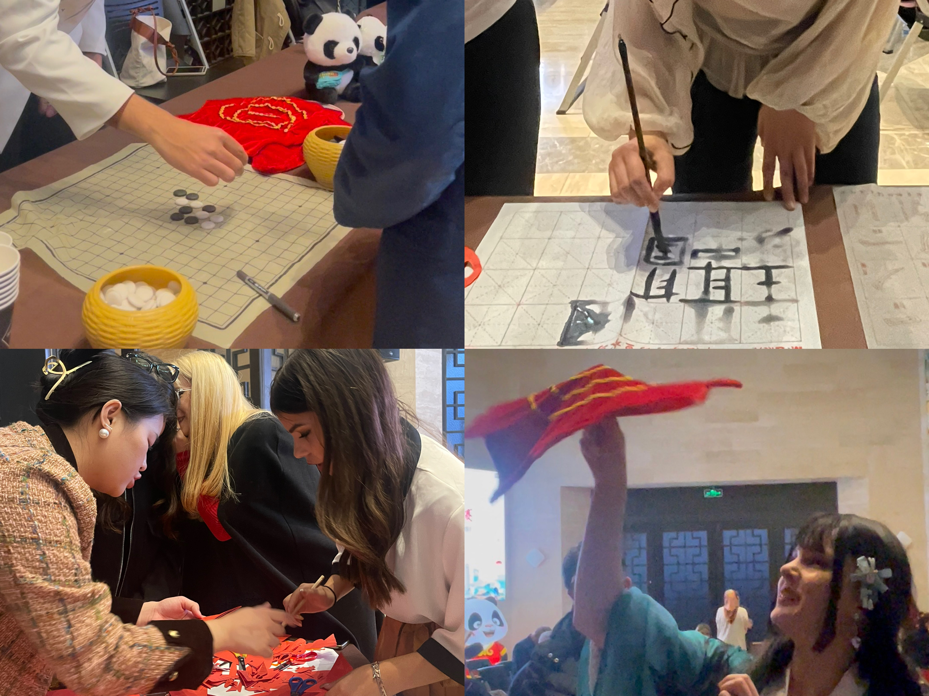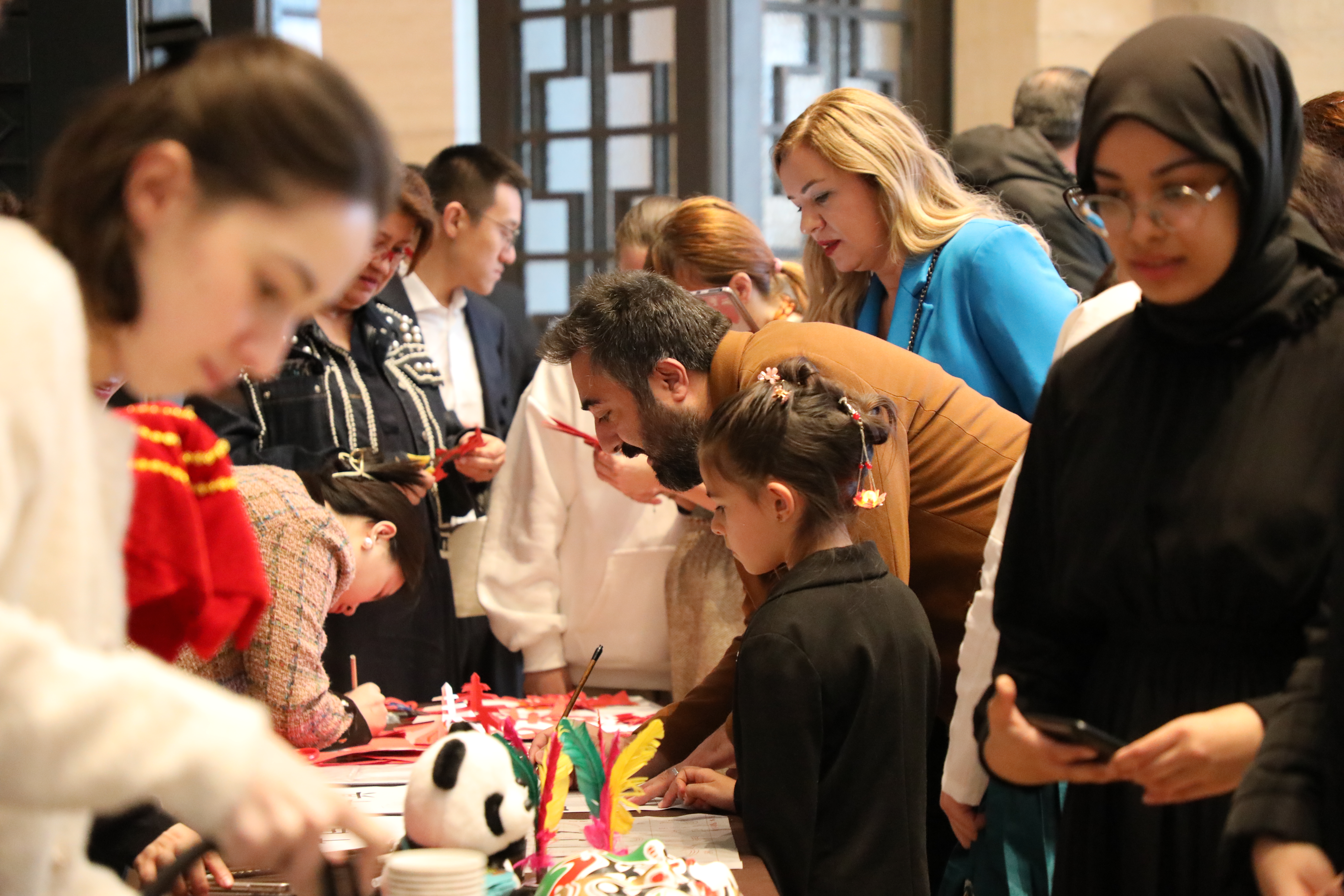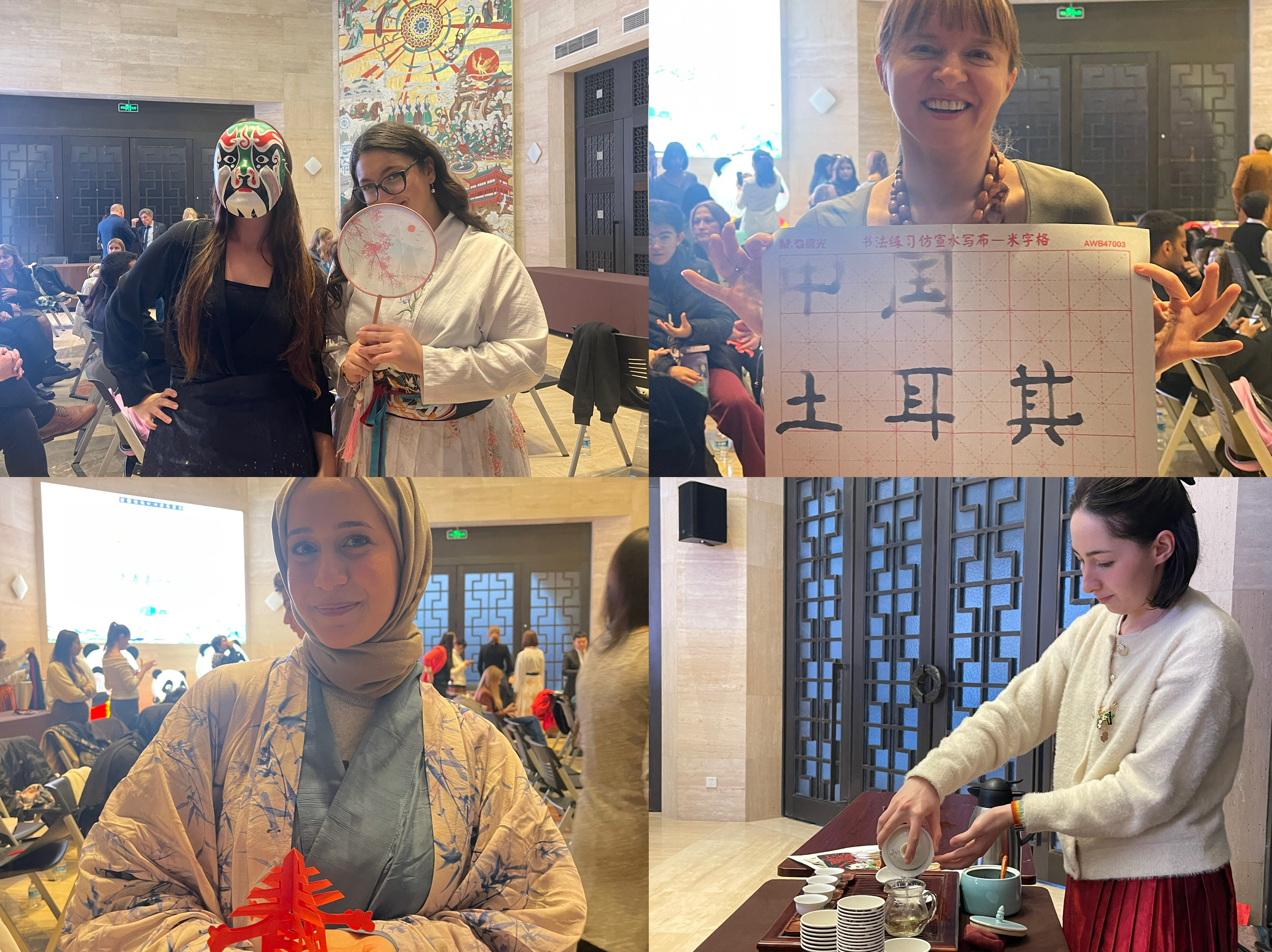 在剪纸体验区,学生们跟随指导老师学习基本技法,创作出独具匠心的作品;在书法展台,参与者通过临摹汉字“土耳其”和“中国”,感受了汉字的艺术之美;五子棋区则吸引了众多学生尝试,通过对弈领略中国传统棋艺的博大精深;在茶艺展台,志愿者学生演示了中国的茶道,并请参与者品尝了美味的西湖龙井茶。孔院另外还设置了踢毽子、“转手帕”等参与性强的活动项目,吸引了众多参与者前来“打卡”拍照。