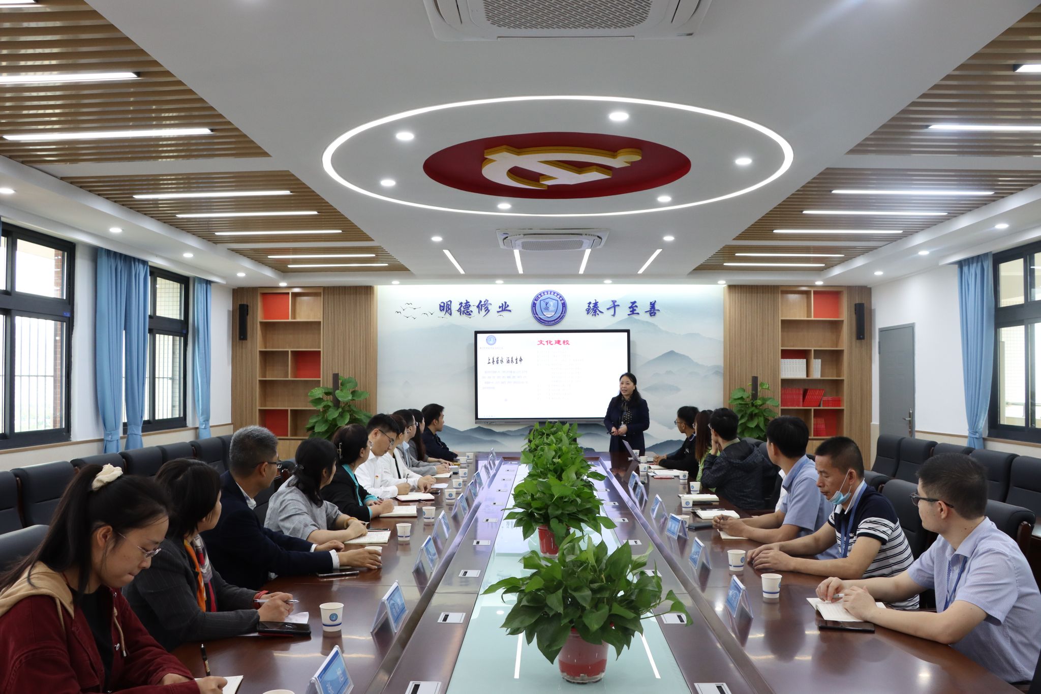 相关人员一行在苏静的带领下参观校园后开展座谈。苏静从翔城中学学校概况、办学思路、主要工作三方面对全面系统地讲解介绍了翔城中学,将学校文化建校、空间建校、队伍建校、制度建校、课程建校、数字建校等各维度的精神内涵及理念深入浅出地进行了讲解。