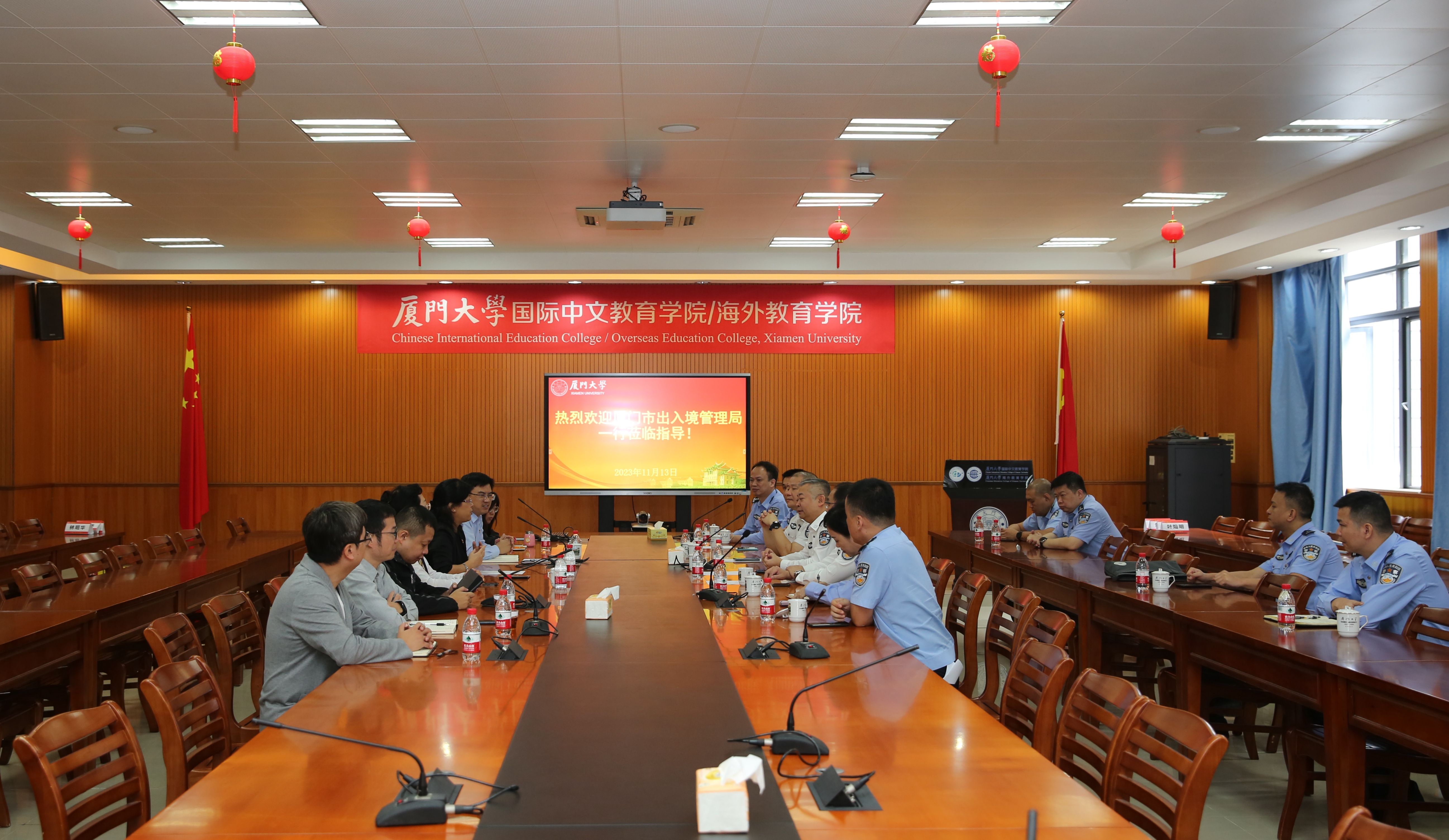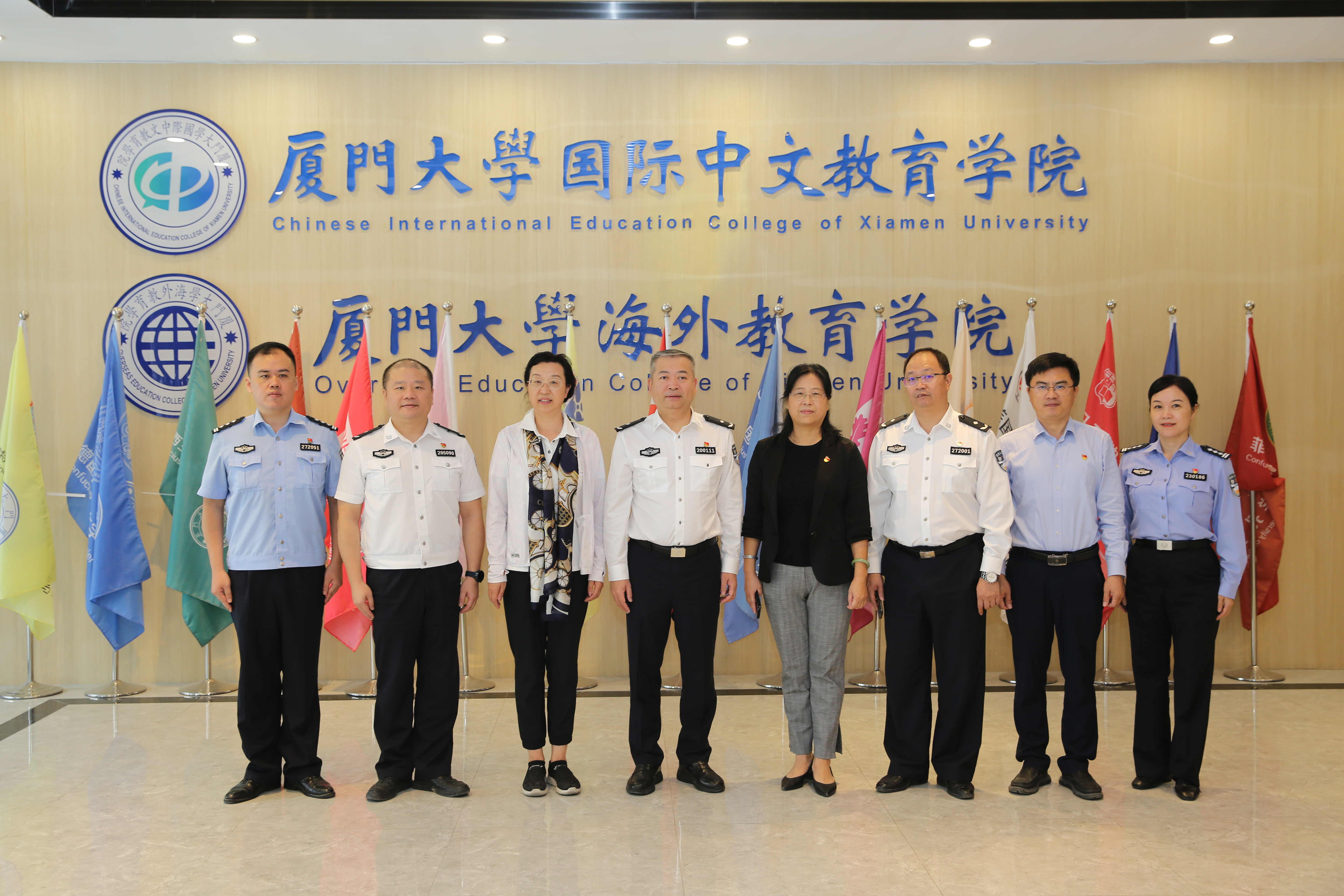 11月13日上午,厦门市公安局出入境管理支队长戴伟荣、翔安区副区长、翔安公安分局局长吕培勤,翔安公安分局政治委员吕春杭,率厦门市公安局出入境管理支队周向青处长、叶灿明大队长、林春品大队长和翔安区公安局警官一行,到访厦门大学国际中文教育学院/海外教育学院,就学院国际学生教育管理工作展开调研。国际中文教育学院/海外教育学院党委书记范丽、院长陈志伟、党委副书记林明华以及学院行政、辅导员代表参加调研。